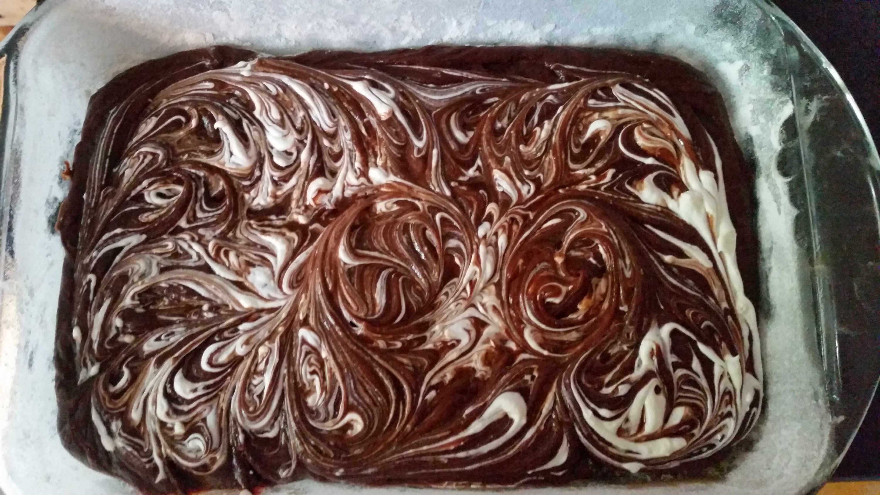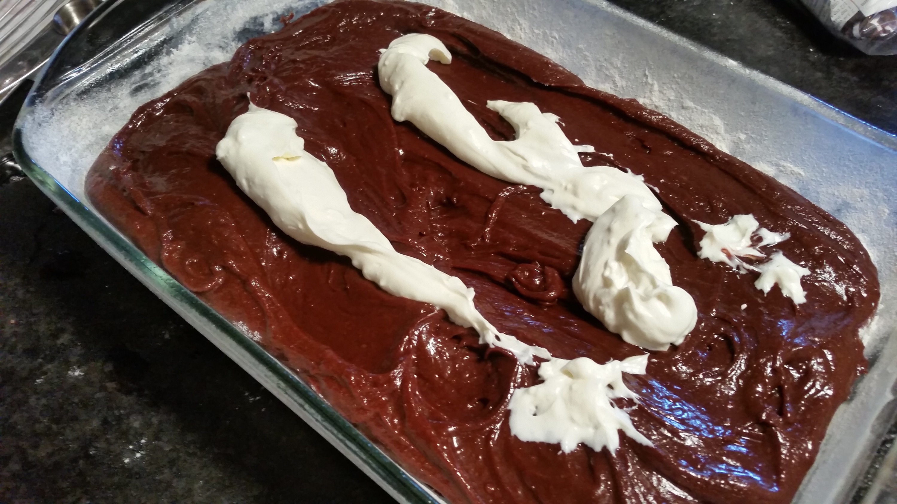 I melted 8oz of cream cheese in a double boiler then dropped globs of the goodness on top of the batter.