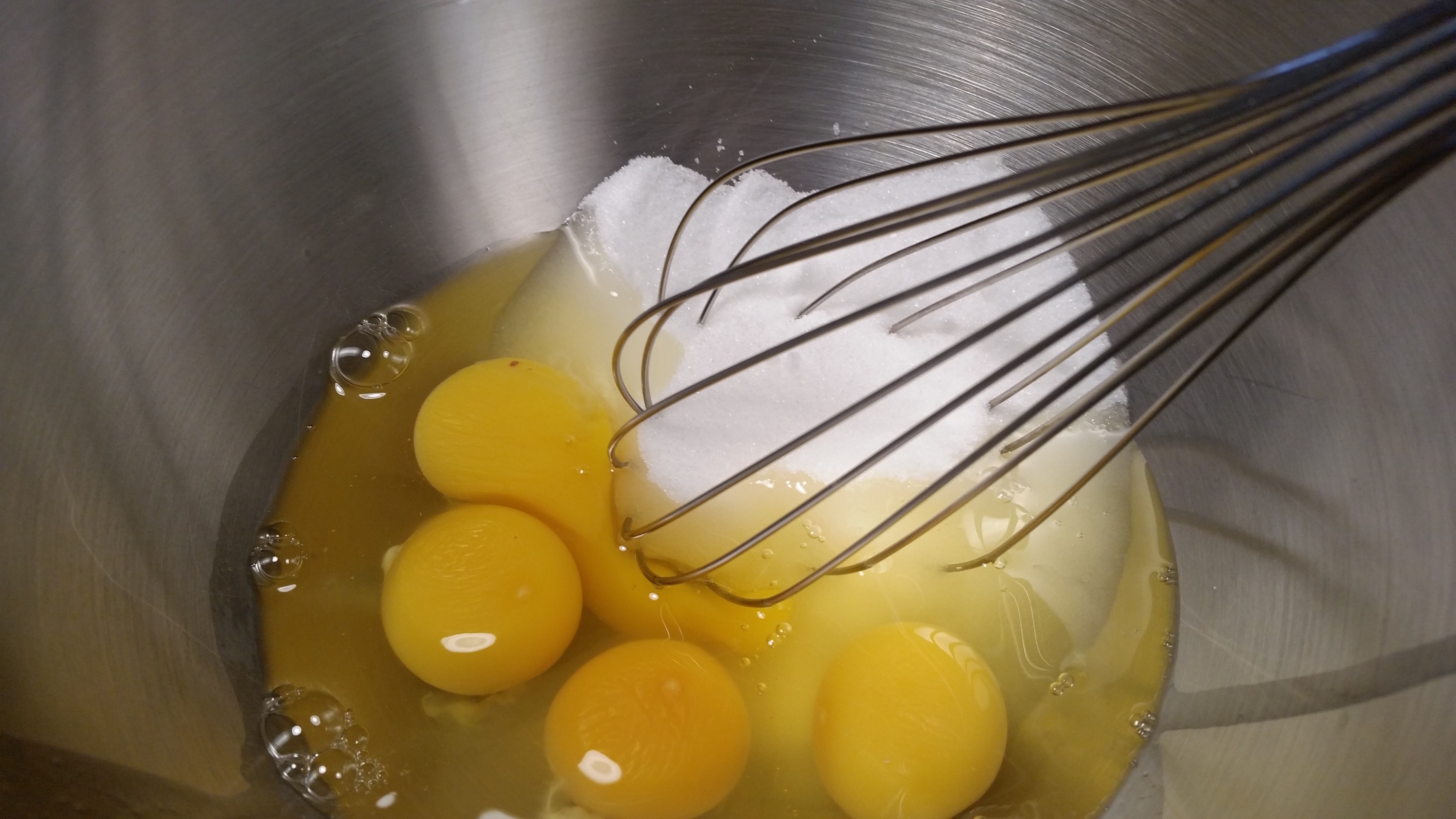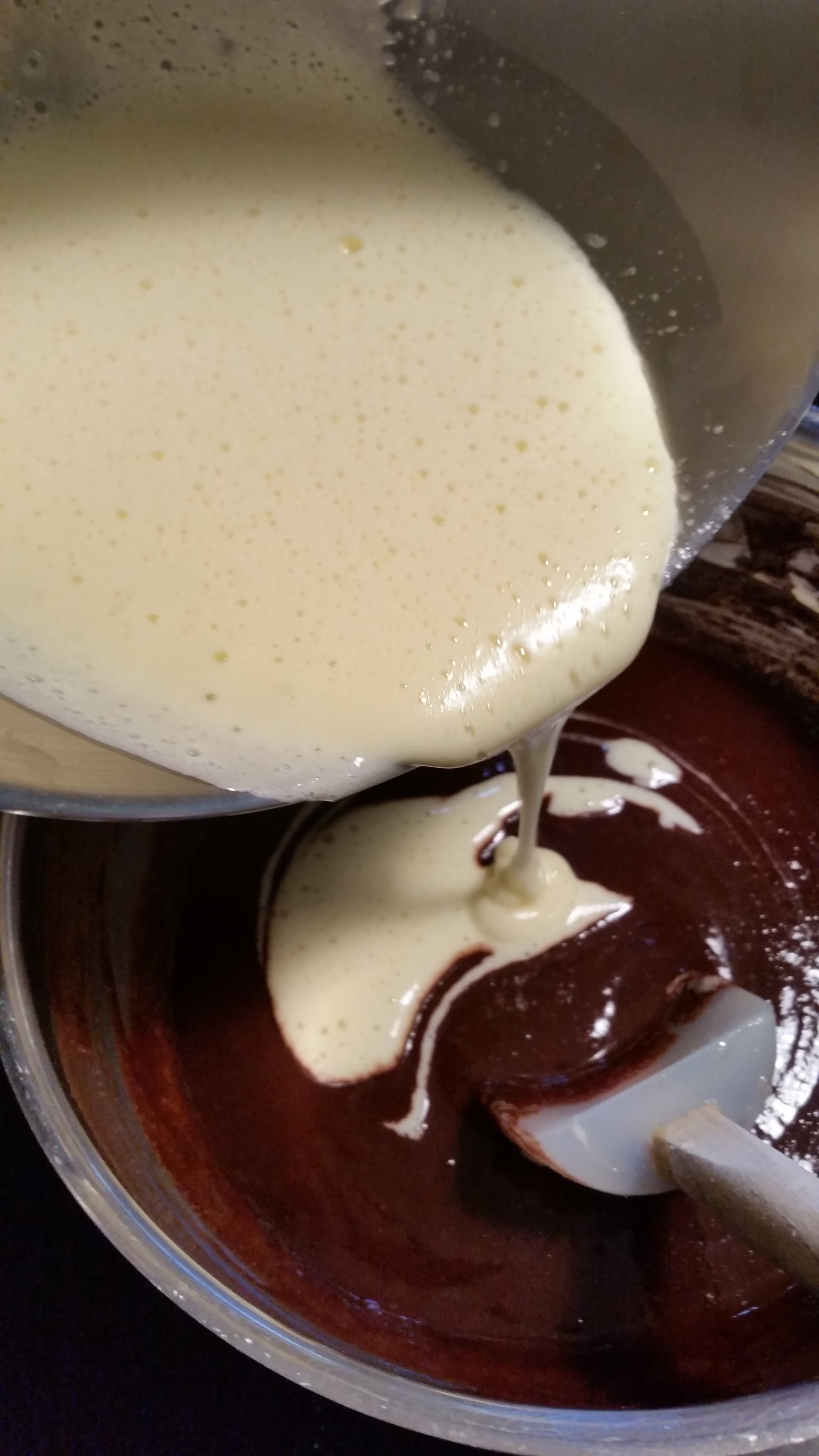With the whisk attachment or with a hand mixer, until they double in volume. Using a spatula and a light touch, fold the whipped eggs into the chocolate, stopping just short of blending them in completely.