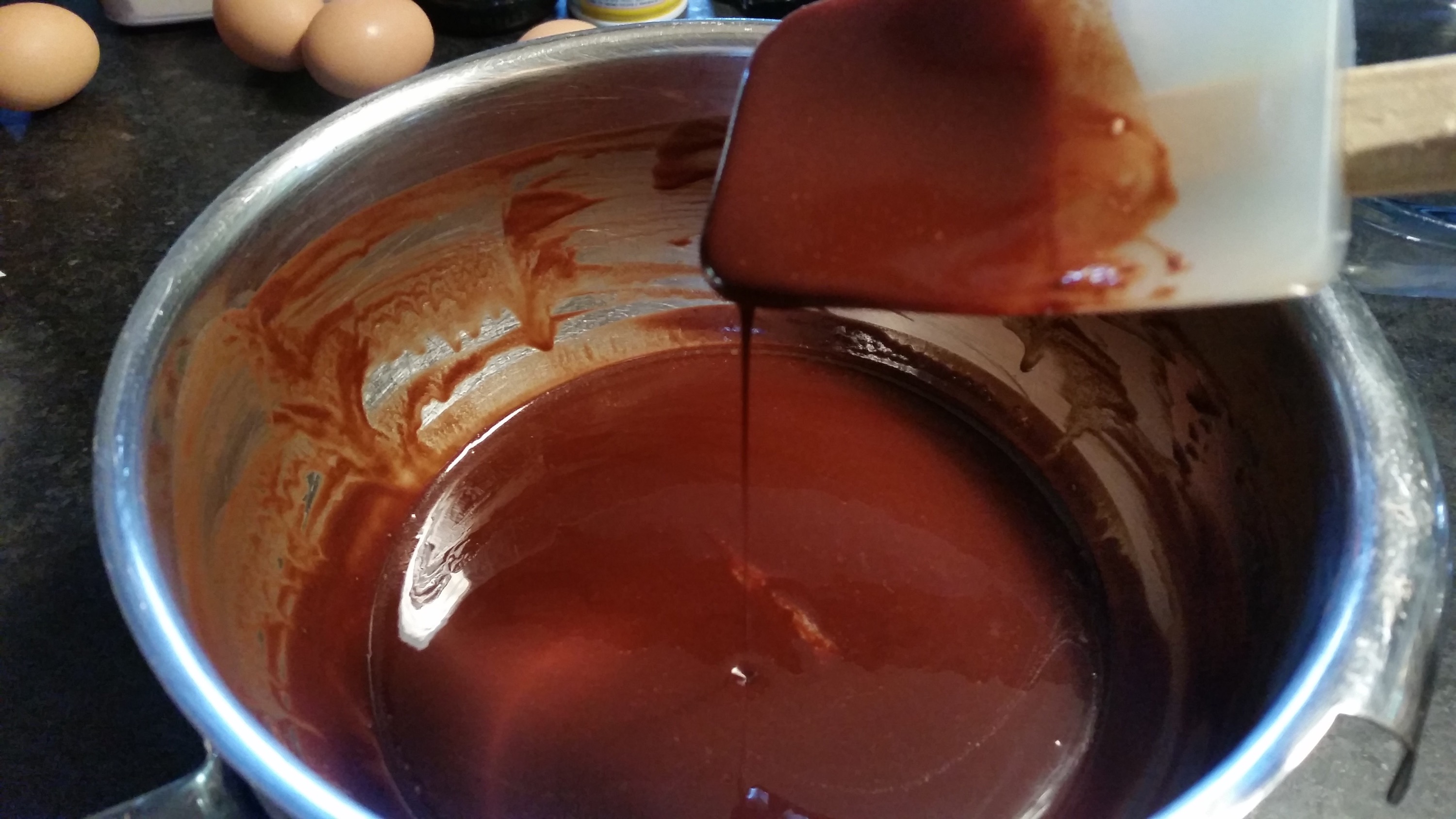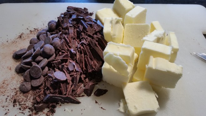 Set a heat proof bowl over a saucepan of gently simmering water, put the butter and chocolate in. Stir frequently until the ingredients are just melted-you don’t want them to get so hot that the butter separates. Add 1 c. sugar and whisk gently just to incorporate it, then remove the bowl from the pan of water. Stir in the vanilla and transfer to a large bowl.