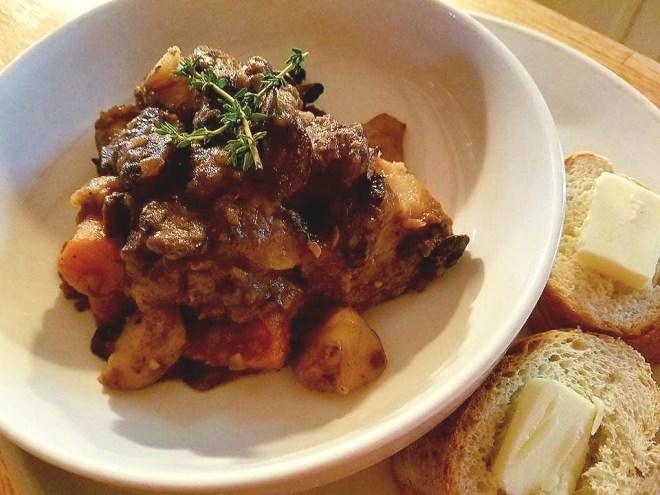 My mum made this a lot when we were kids but I only ever ate the potatoes (shocker). I now use a recipe I found in Cooking LIght, years ago. I’ve slightly modified it. Most recipes call for simmering on the stovetop for hours. No matter how low I turn down the gas, it’s not low enough. The meat doesn’t ever seem to tenderize…it just boils. I’ve taken a different approach and I now finish it off in the oven….At a very low heat (250). The meat just falls apart.