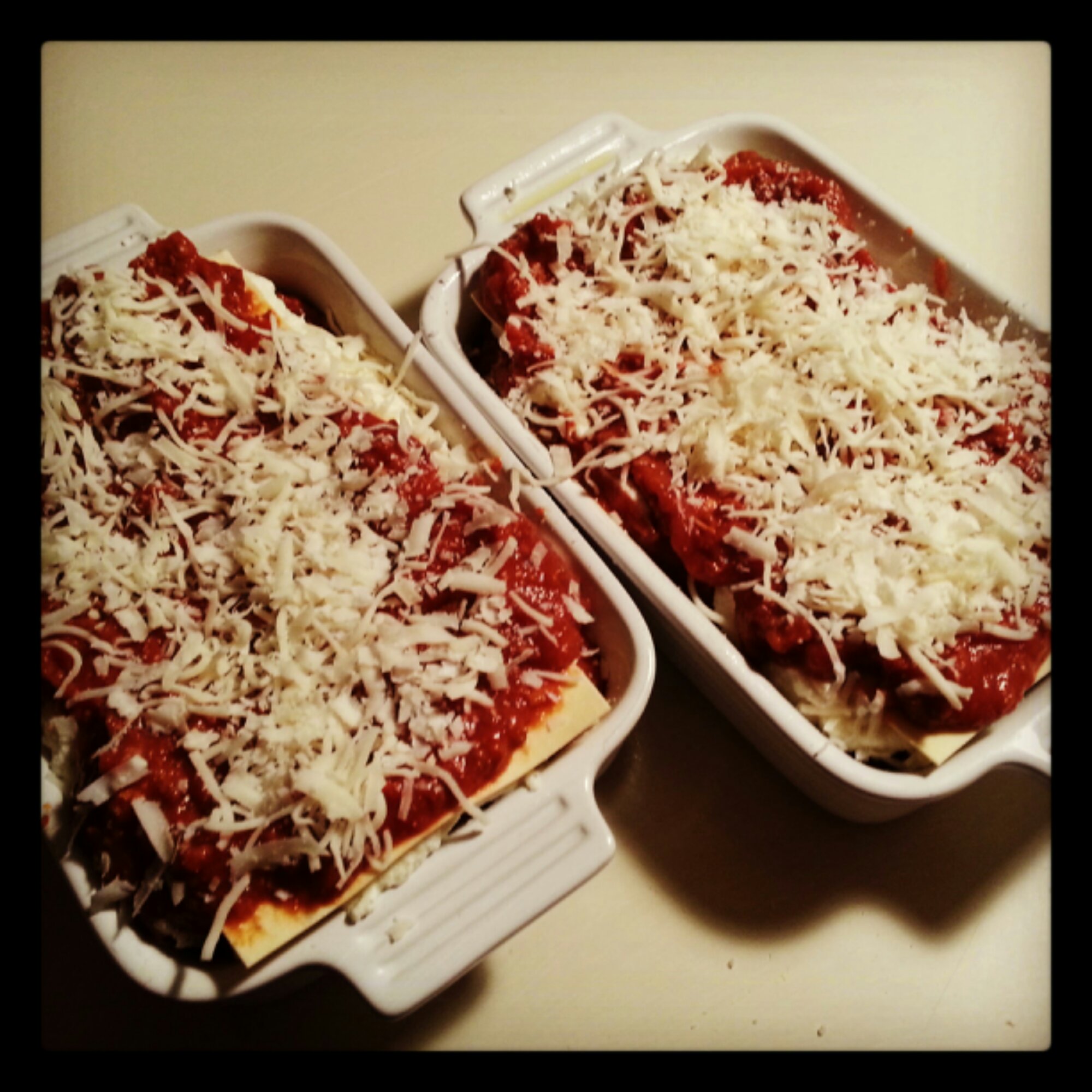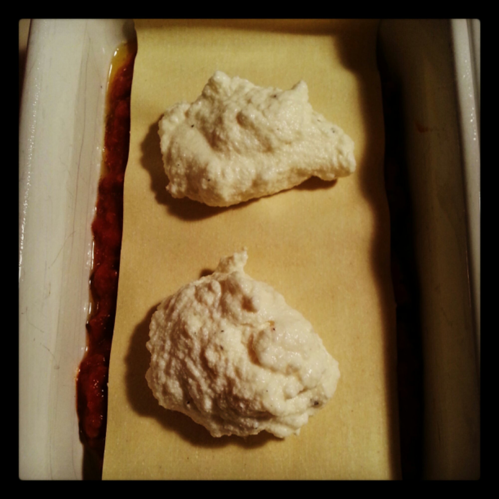 I had bolognese in the freezer so I let that thaw for the day. Stevo braved the ‘Holy shit, it’s snowing!!’ crowds and picked up some ricotta, eggs, mozzarella and Barilla no-boil noodles.