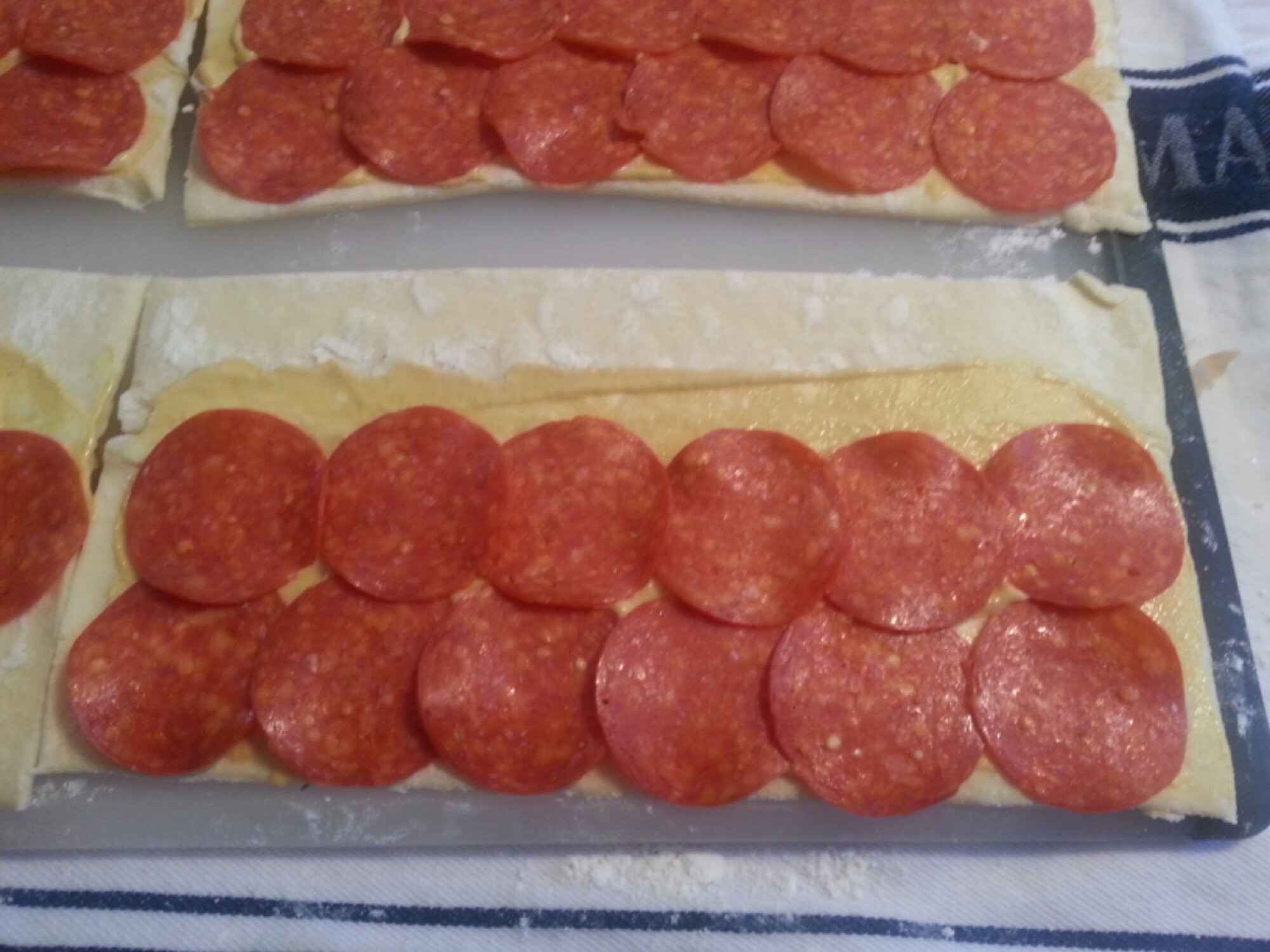 Cut the sheets, lengthwise, in half. Spread the dijon and add a layer of pepperoni.
