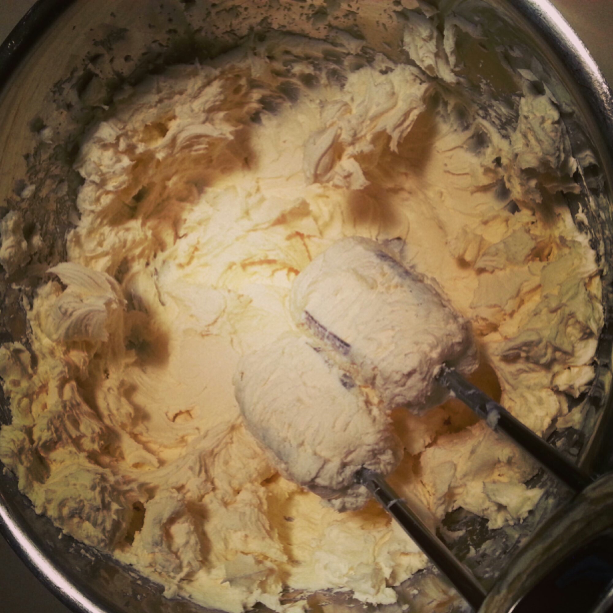 Put the room temp cream cheese in a double boiler on low… Like super low. As soon as it’s not stiff, take it off and add the sugar and vanilla (5 mins).