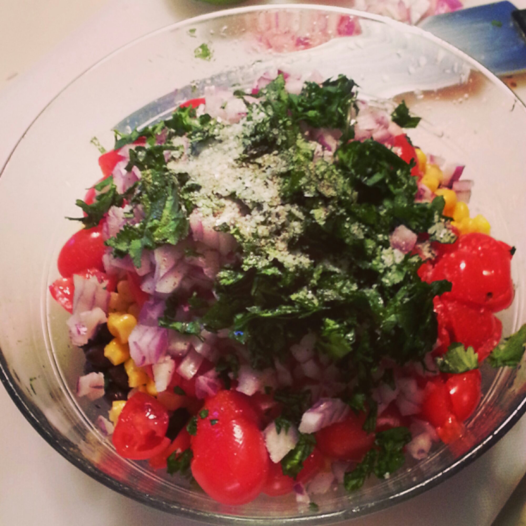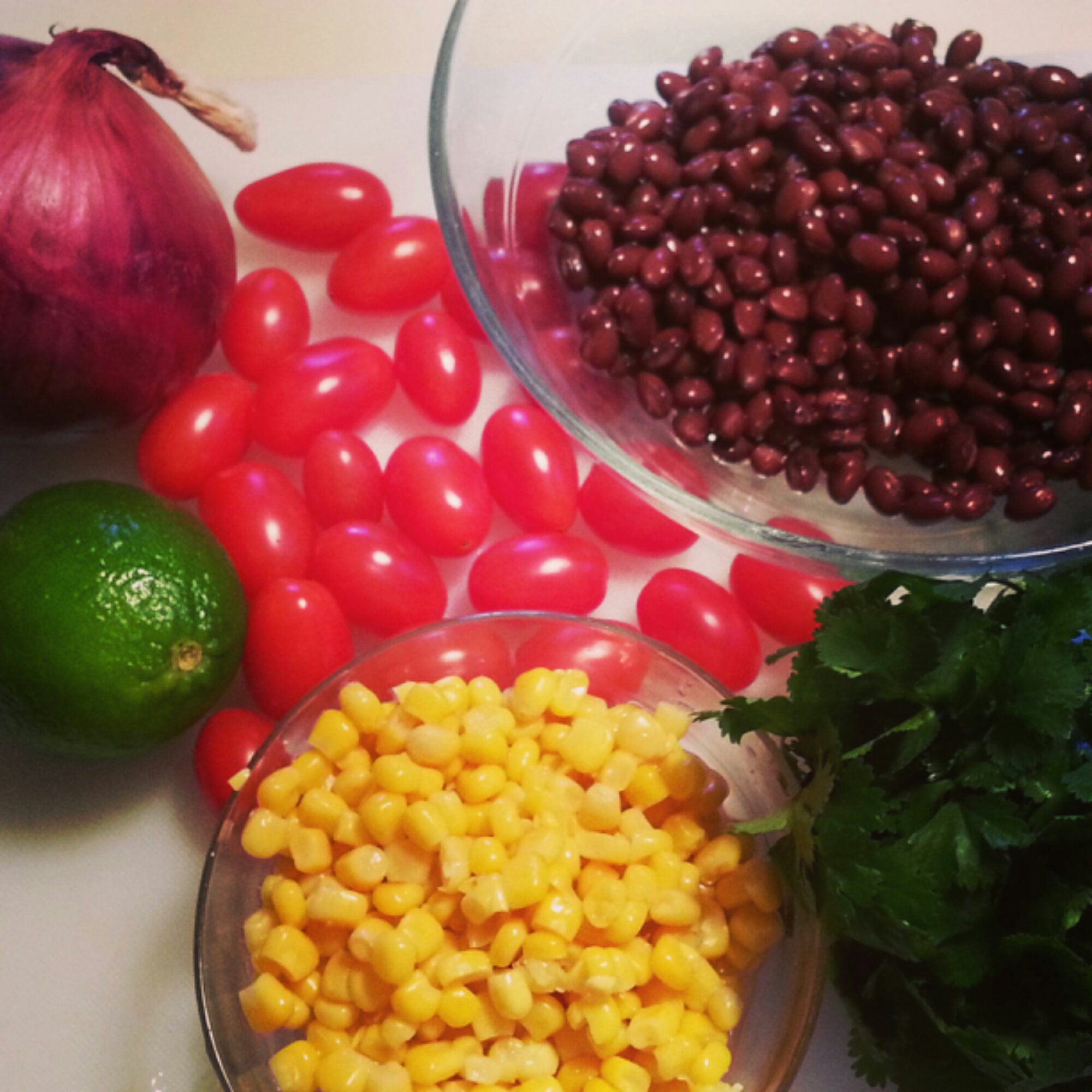 These simple ingredients make the salad. The original recipe calls for avocado but I’ll often make it without, if they’re not ripe enough.