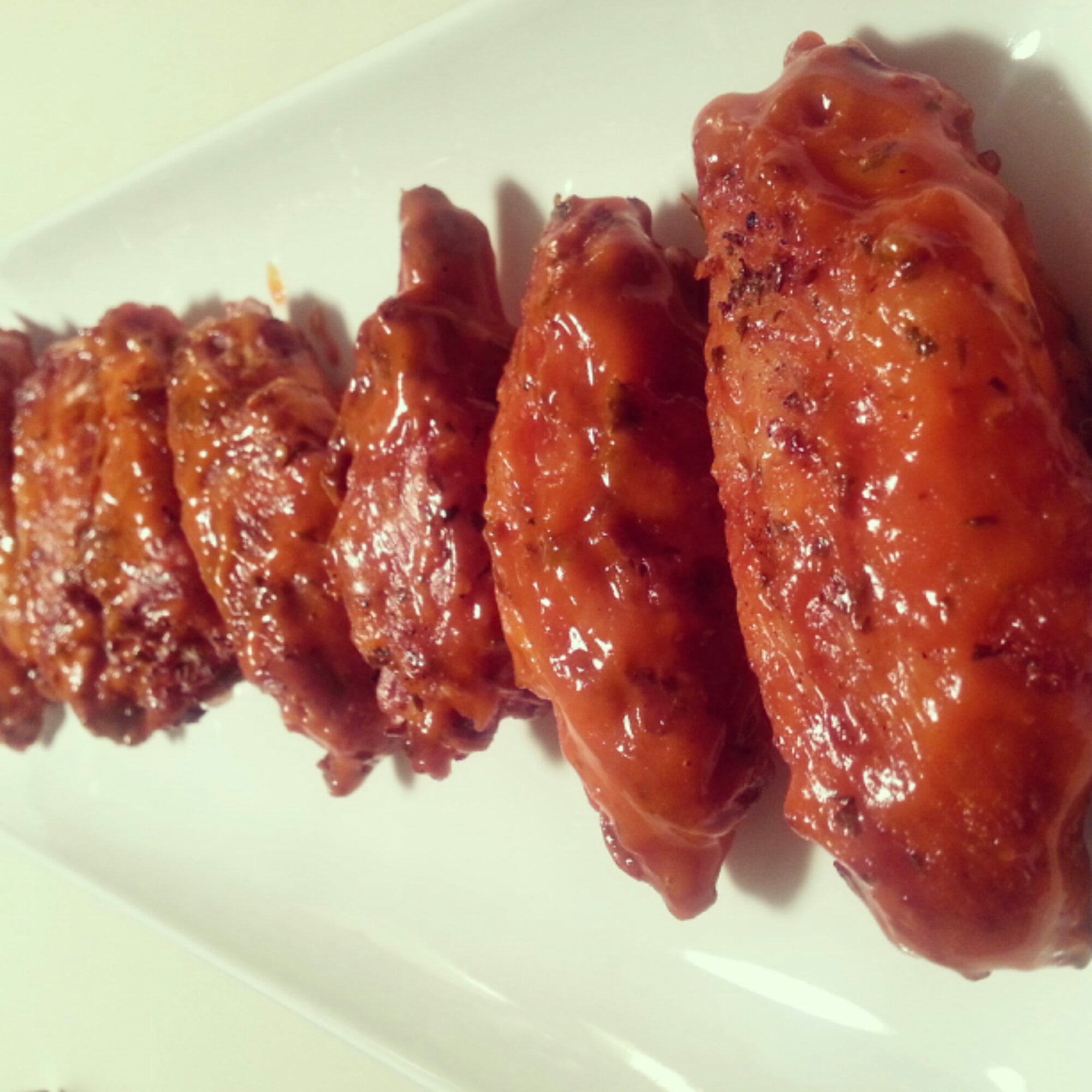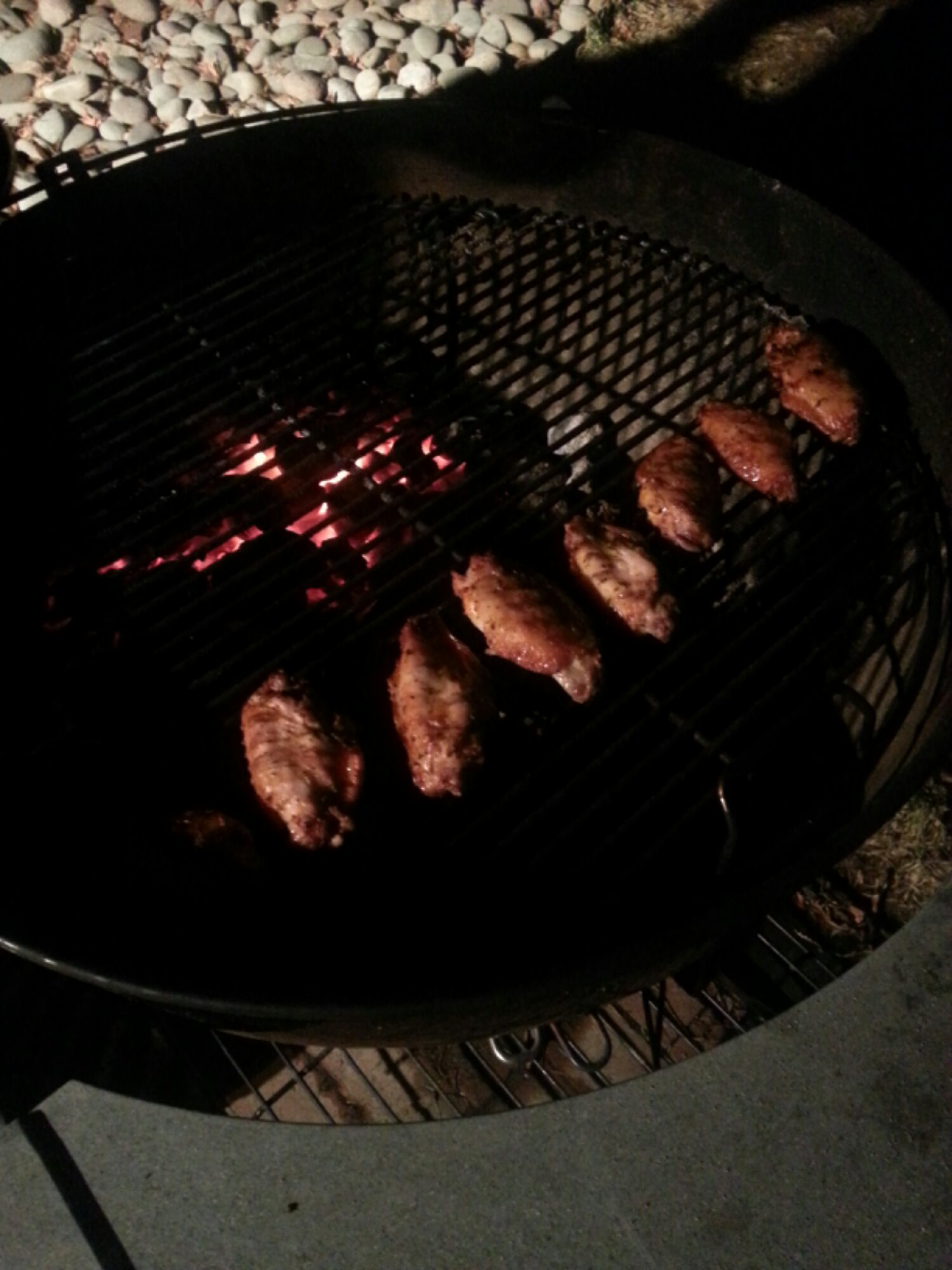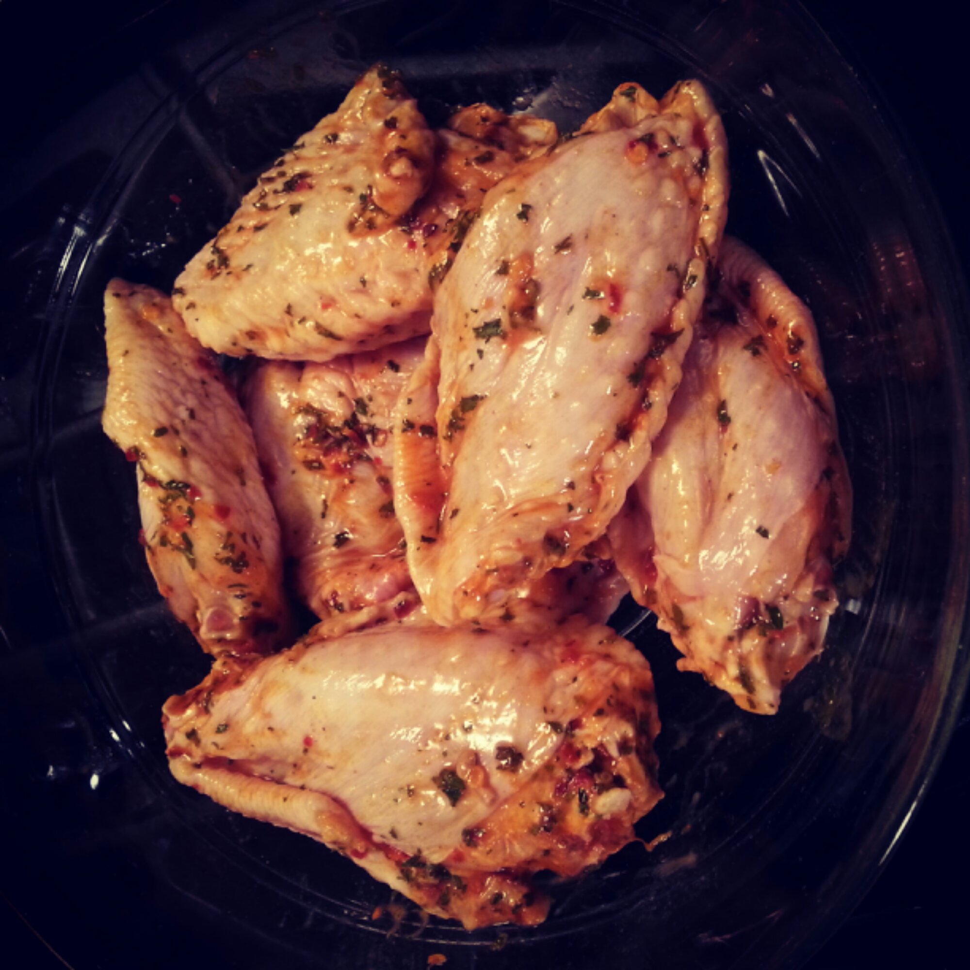 He’s VERY picky about his source of wings. It’s a small butcher a few miles away. The wings come already marinated. A quick sniff test tells me it’s vinegar, olive oil, red pepper flakes, parsley and garlic but I can’t be sure. It has almost a sweet yet spicy aroma. Maybe some sort of sweet chili oil?