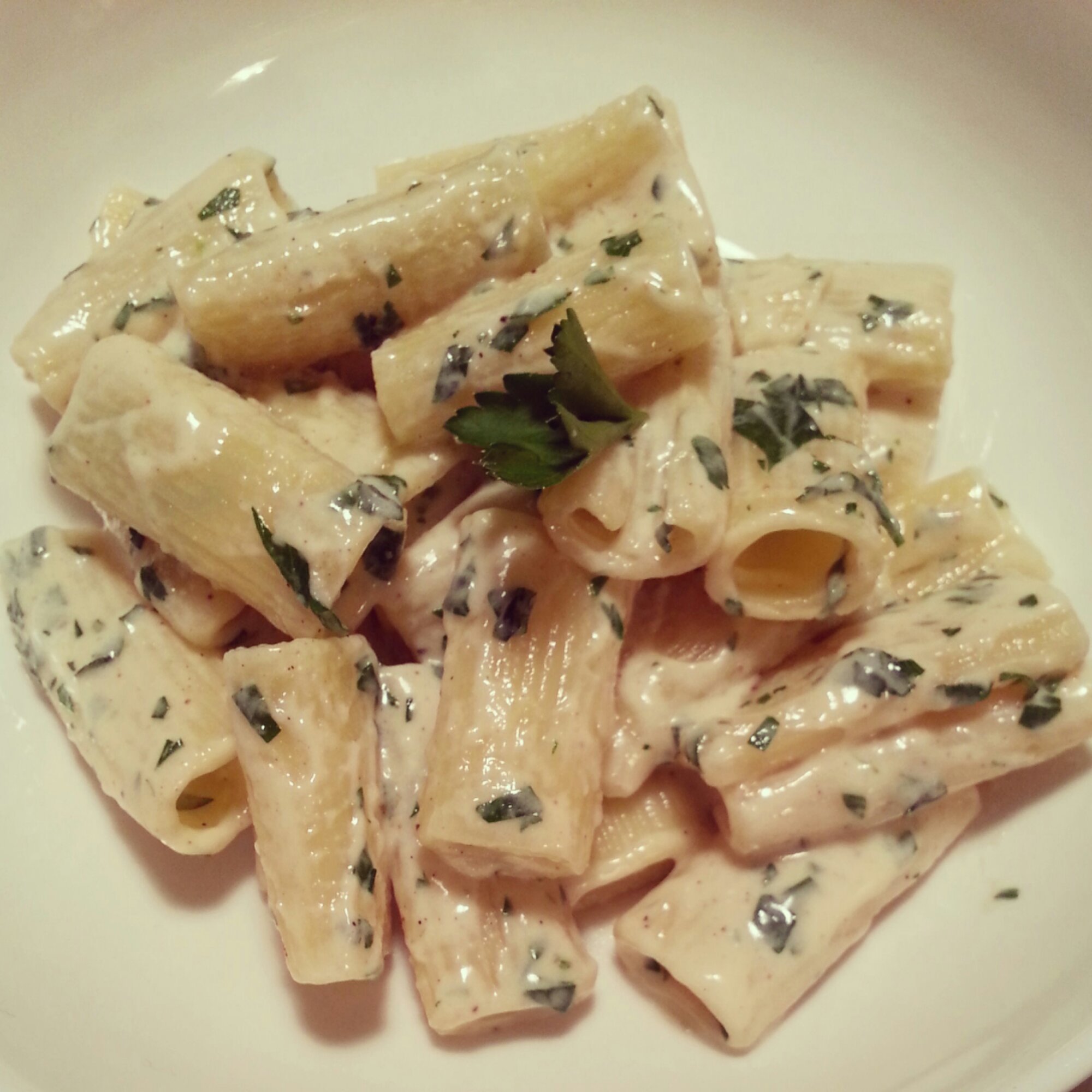 I make this with a variety of pastas. Tonight, I was being super lazy and used what I had. Rigatoni. If the damn football game hadn’t dominated my afternoon, I’d be making fresh pasta.
