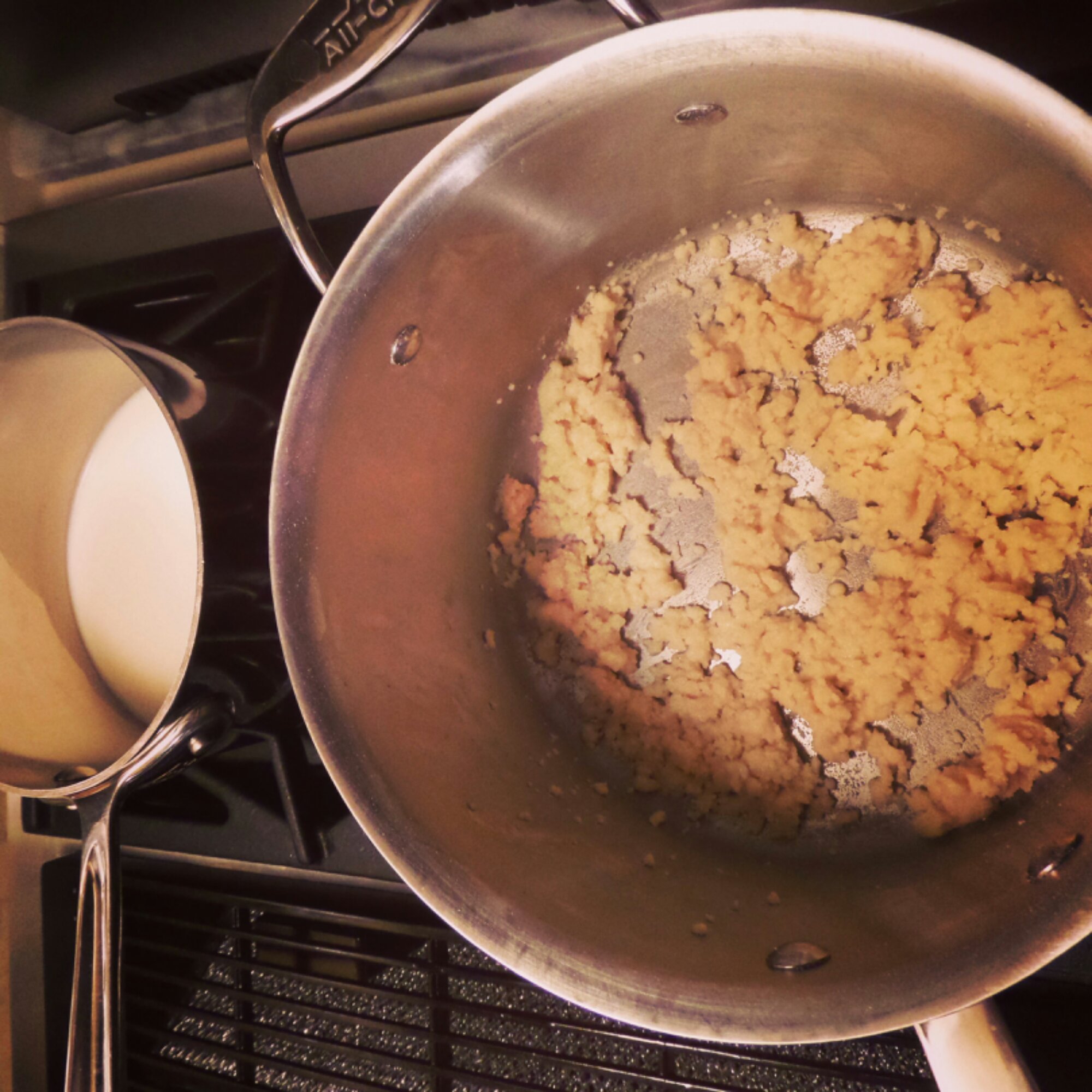 Add the milk and whisk like crazy. This is the only recipe I’ve seen that calls for cold milk to be added. For a typical ‘white sauce’ it would be hot milk added to hot butter and flour. I’m going with it though, after some heavy consideration. Add the cream and the cheeses. Whisk, whisk and whisk some more (and don’t stop until it’s smooth).
