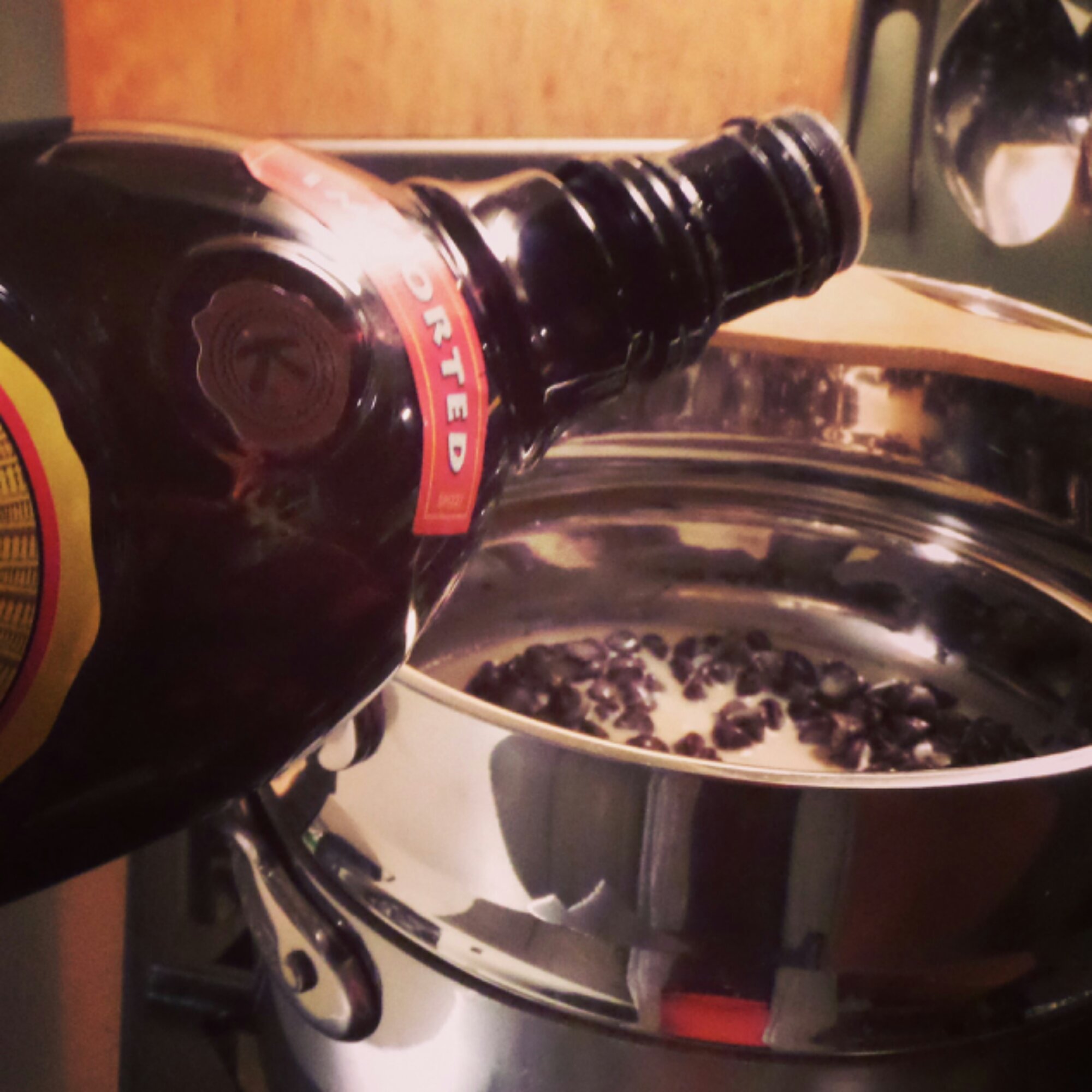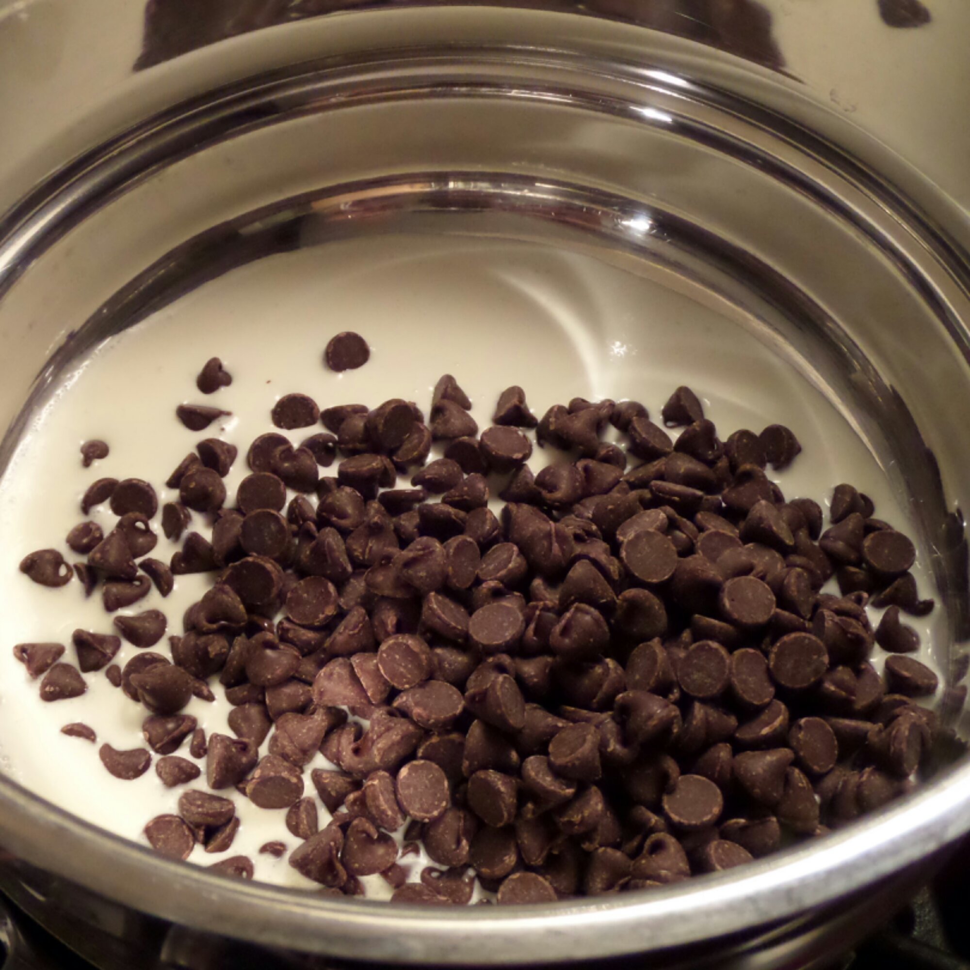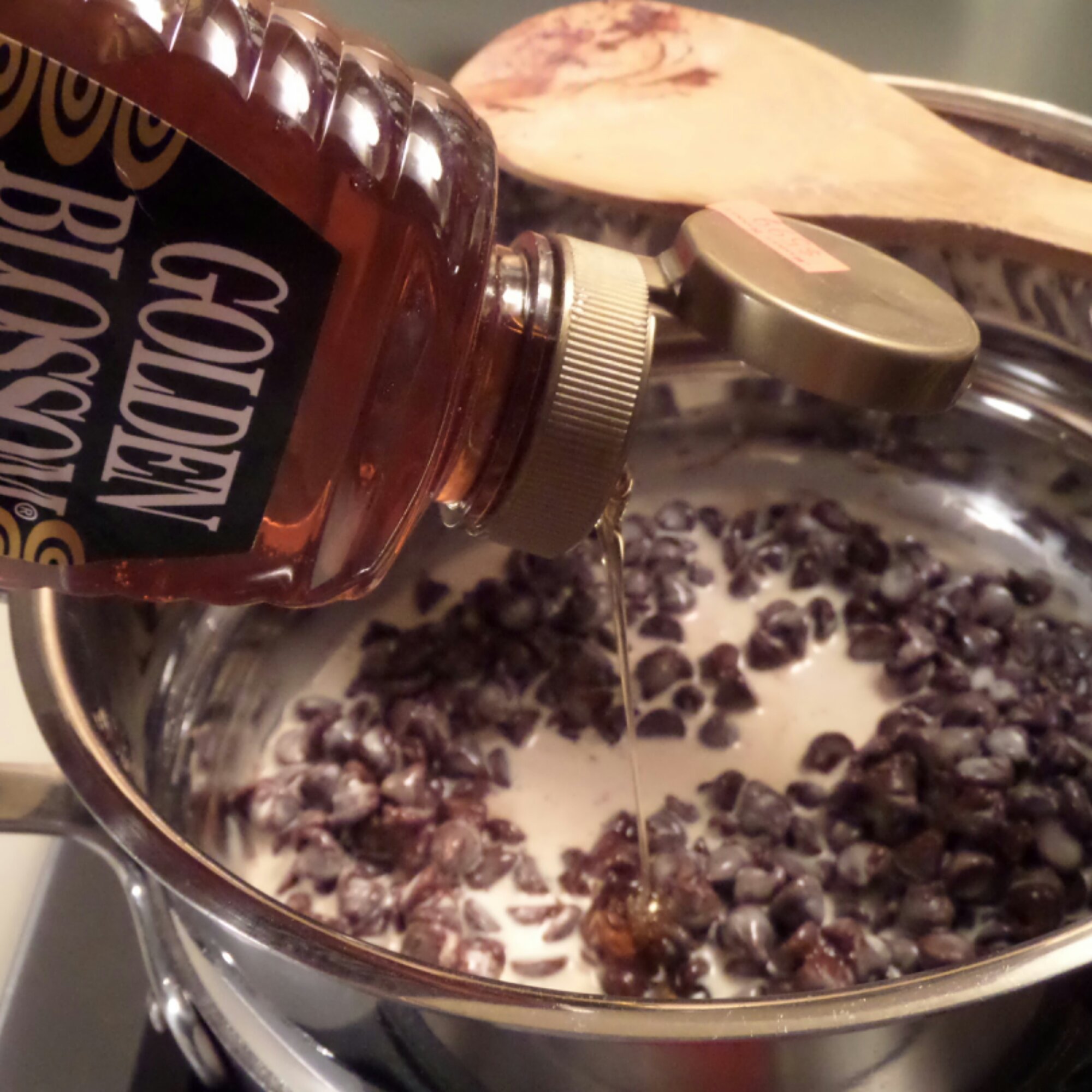 While they were baking, it was time to melt some semisweet chocolate with heavy cream, honey, and Kailua (coffee works as well).