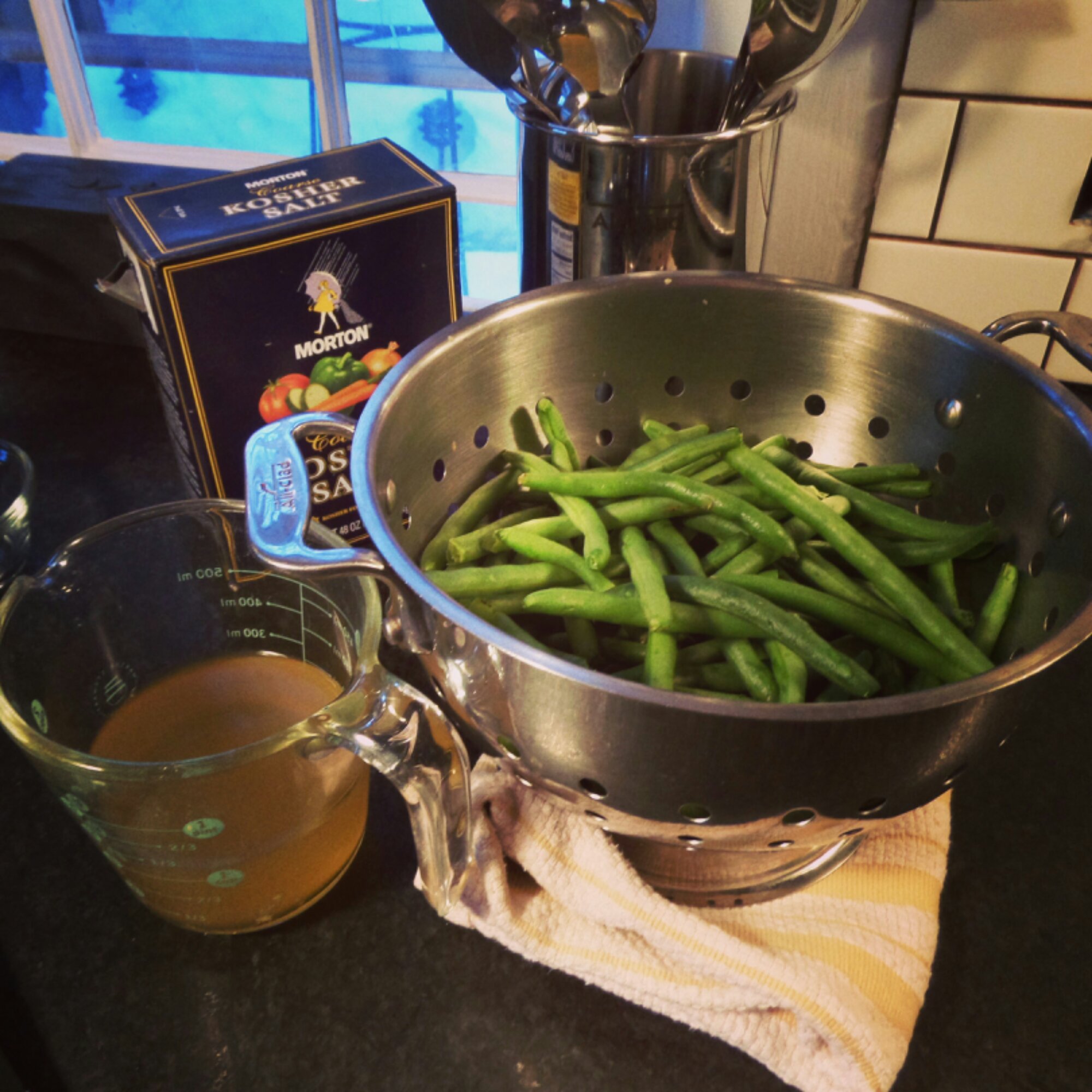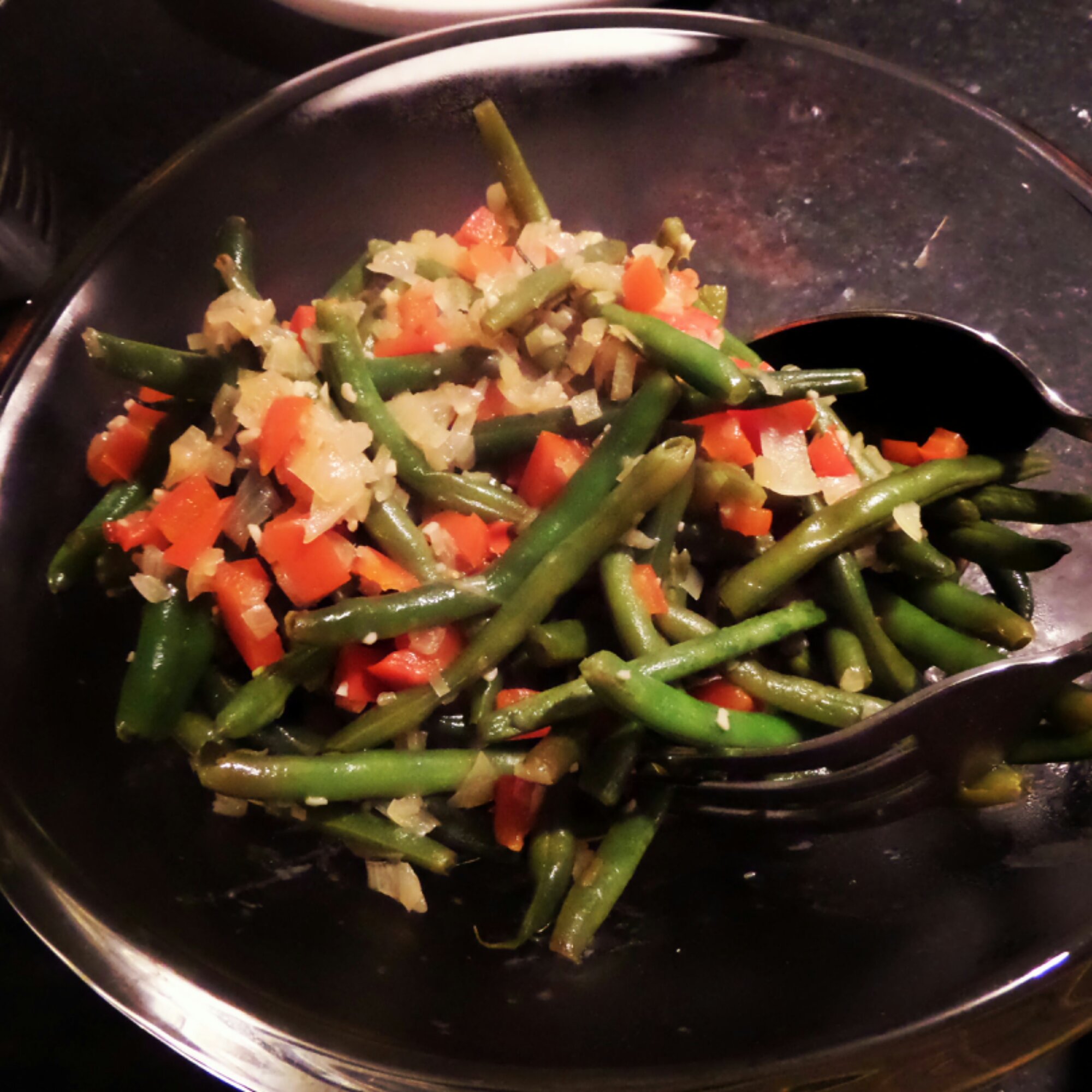I settled on pioneer woman’s recipe. Pretty straight forward. Saute an onion in 2 Tbl of bacon grease (I opted for butter), add the washed and trimmed beans to the skillet and stir until the beans turn bright green (2 minutes).
