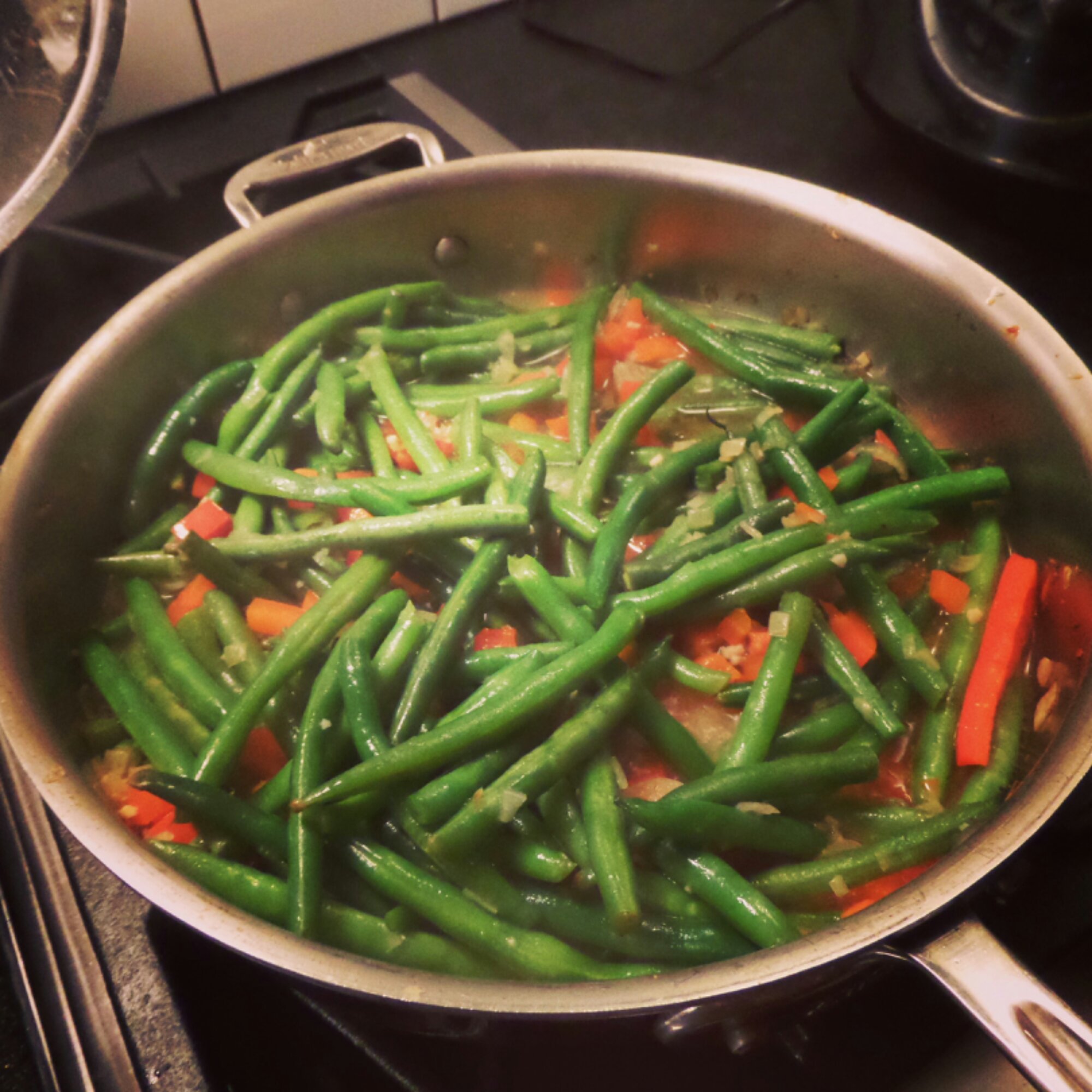 Add a half cup of chicken broth, a diced red bell pepper, turn the gas down to a simmer, partially cover and let them go for 20 minutes. Done