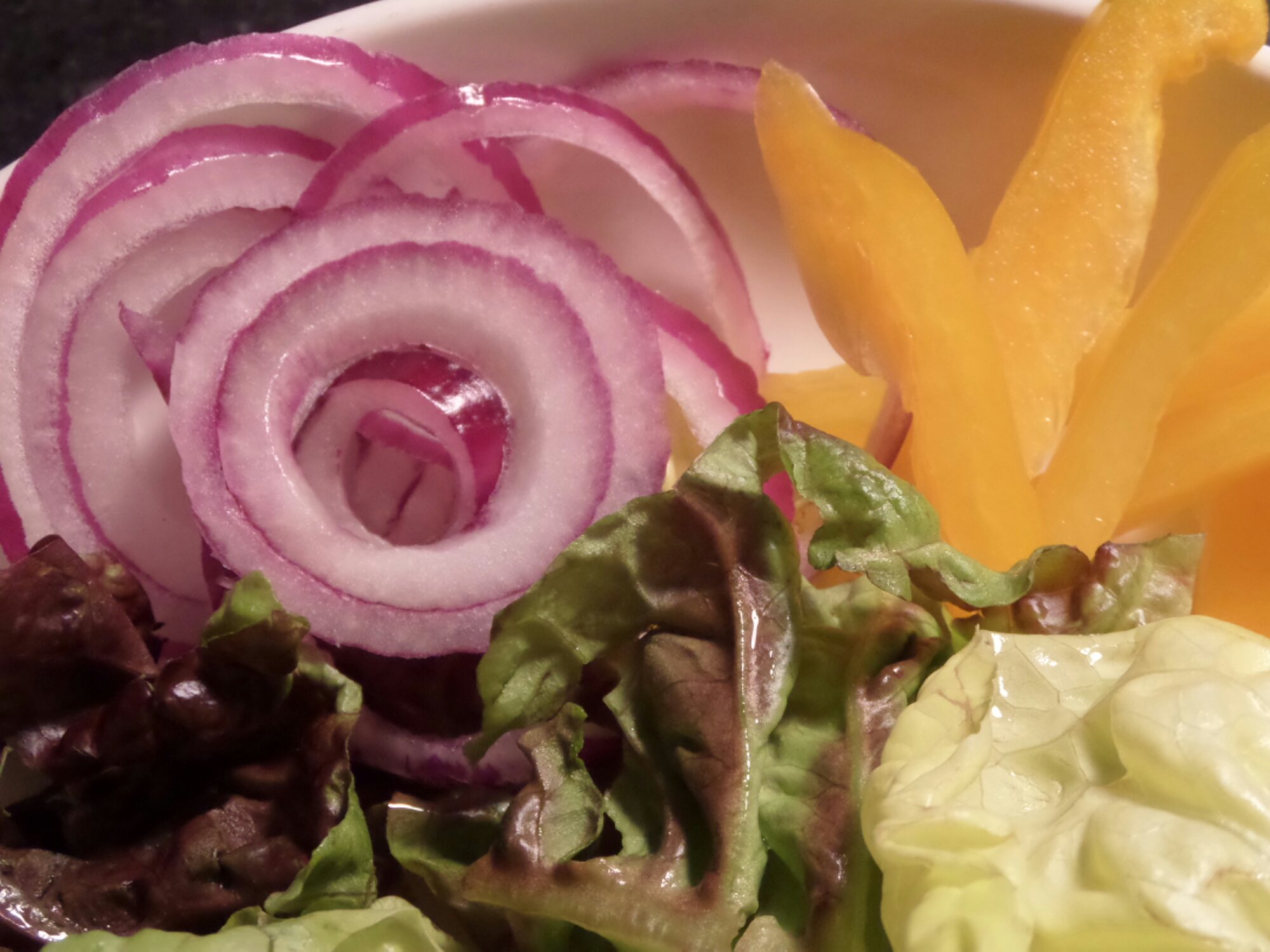 For veggies, I kept it simple with an awesome looking yellow bell pepper and red onions (pretty and crunchy! Check and check).