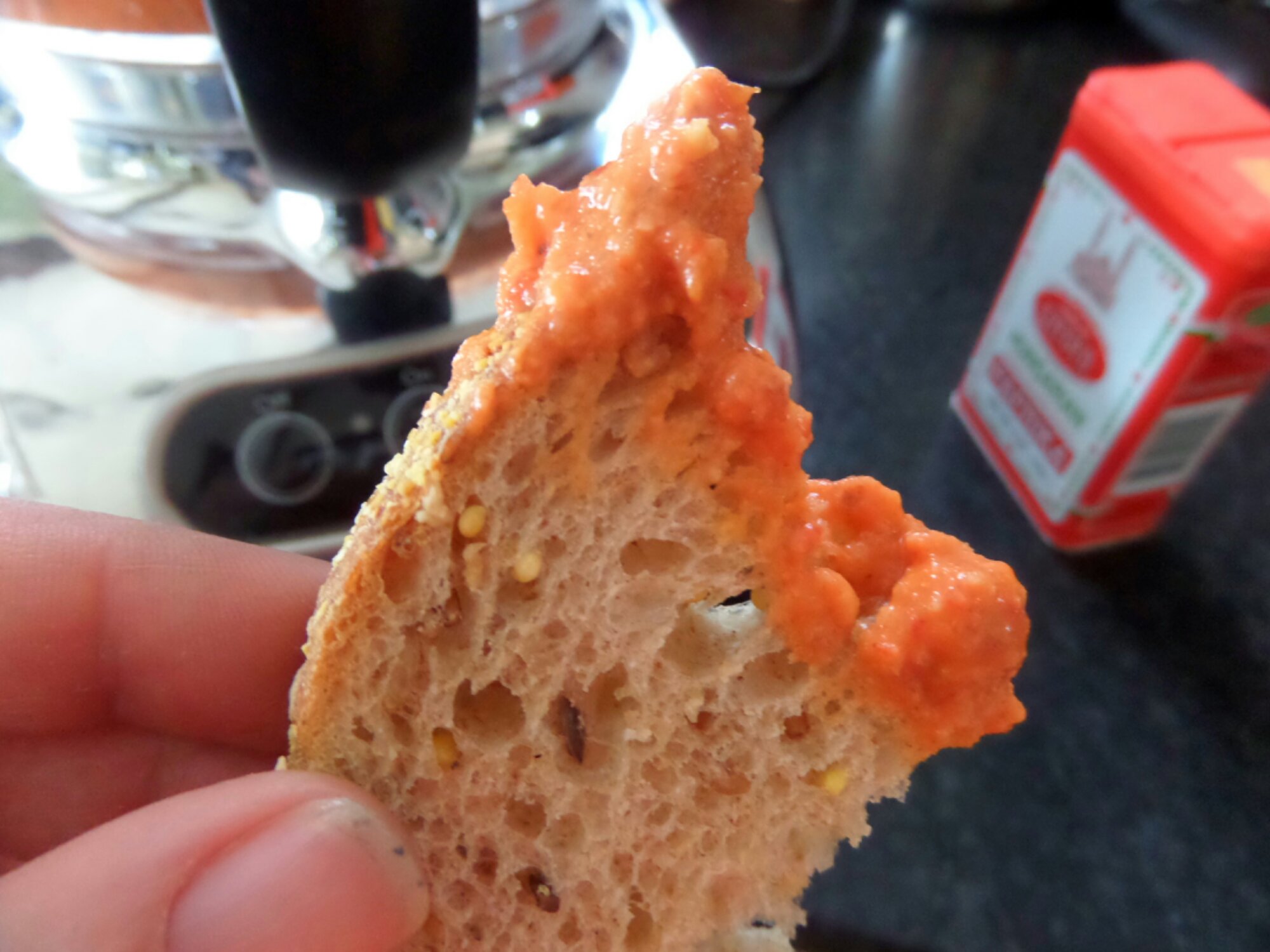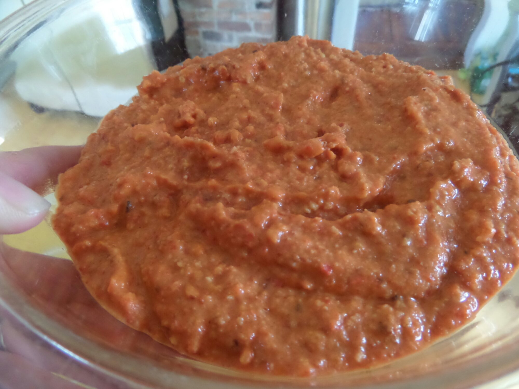 Scrape everything into the blender and add a half cup of roasted almonds, a tsp of paprika, a tbs of red wine vinegar, 2 pieces of bread (toasted), a tbs of red pepper flakes, and blend it well. Add a 1/4 cup of olive oil, while you’re blending it. Season with salt.