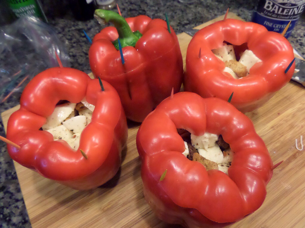 Then it’s time to add croutons to the mix (I used Cesar seasoned croutons but any kind will do). Add about 2 cups to the cheese and stuff the pepper. Place the caps back on and secure with toothpicks.