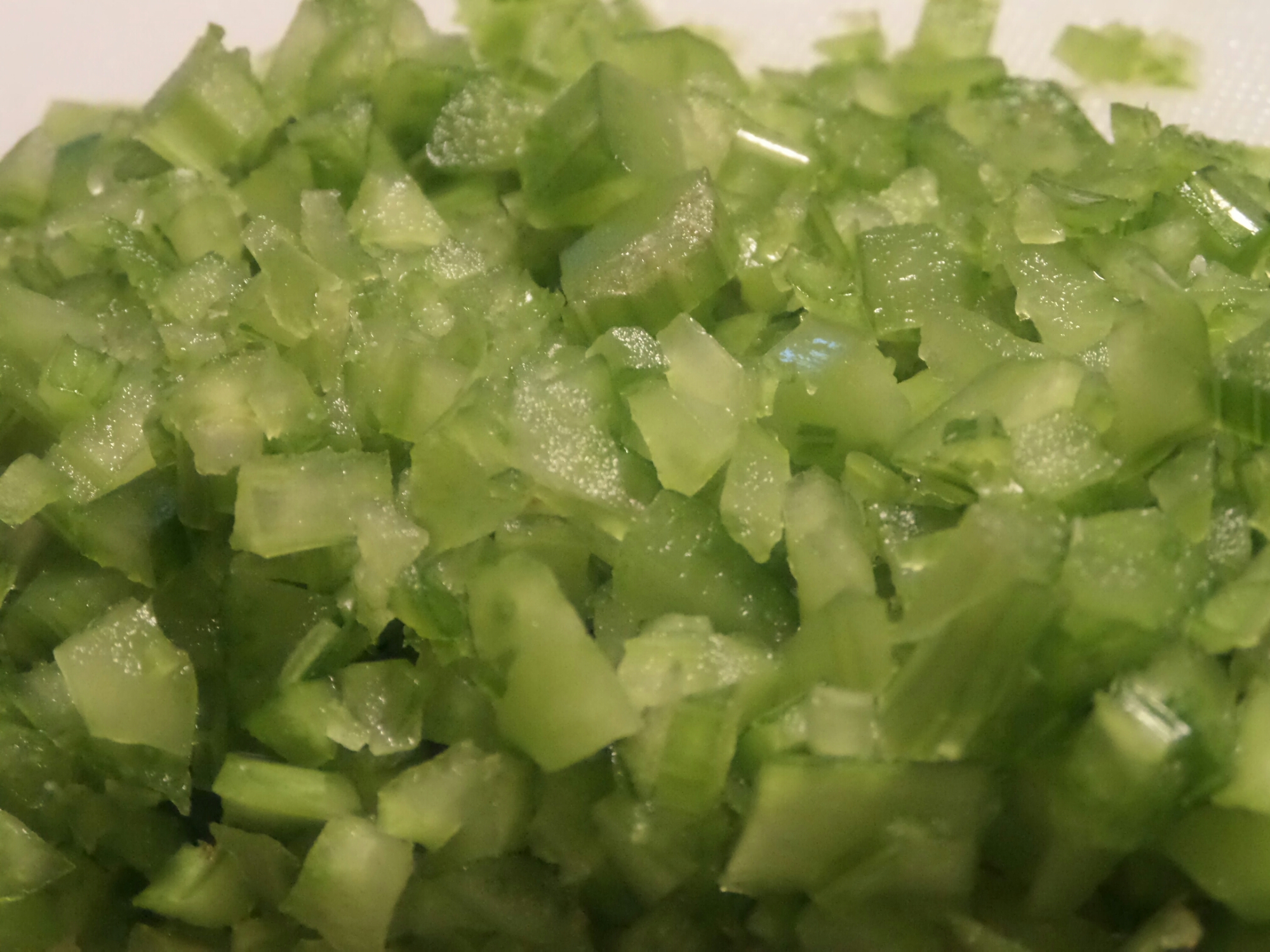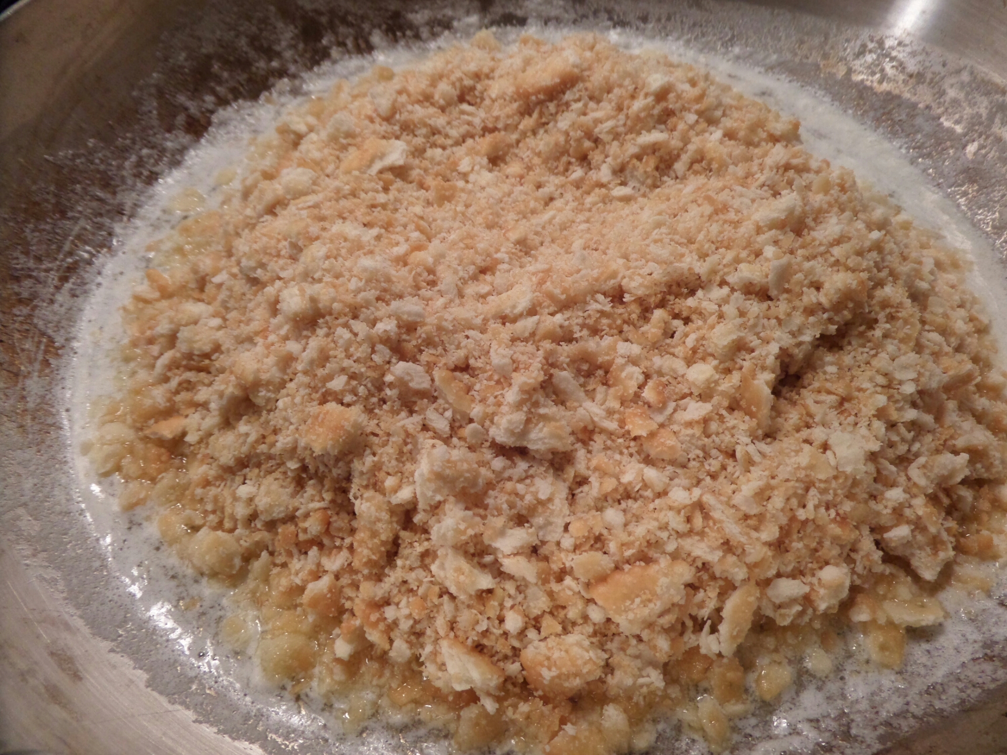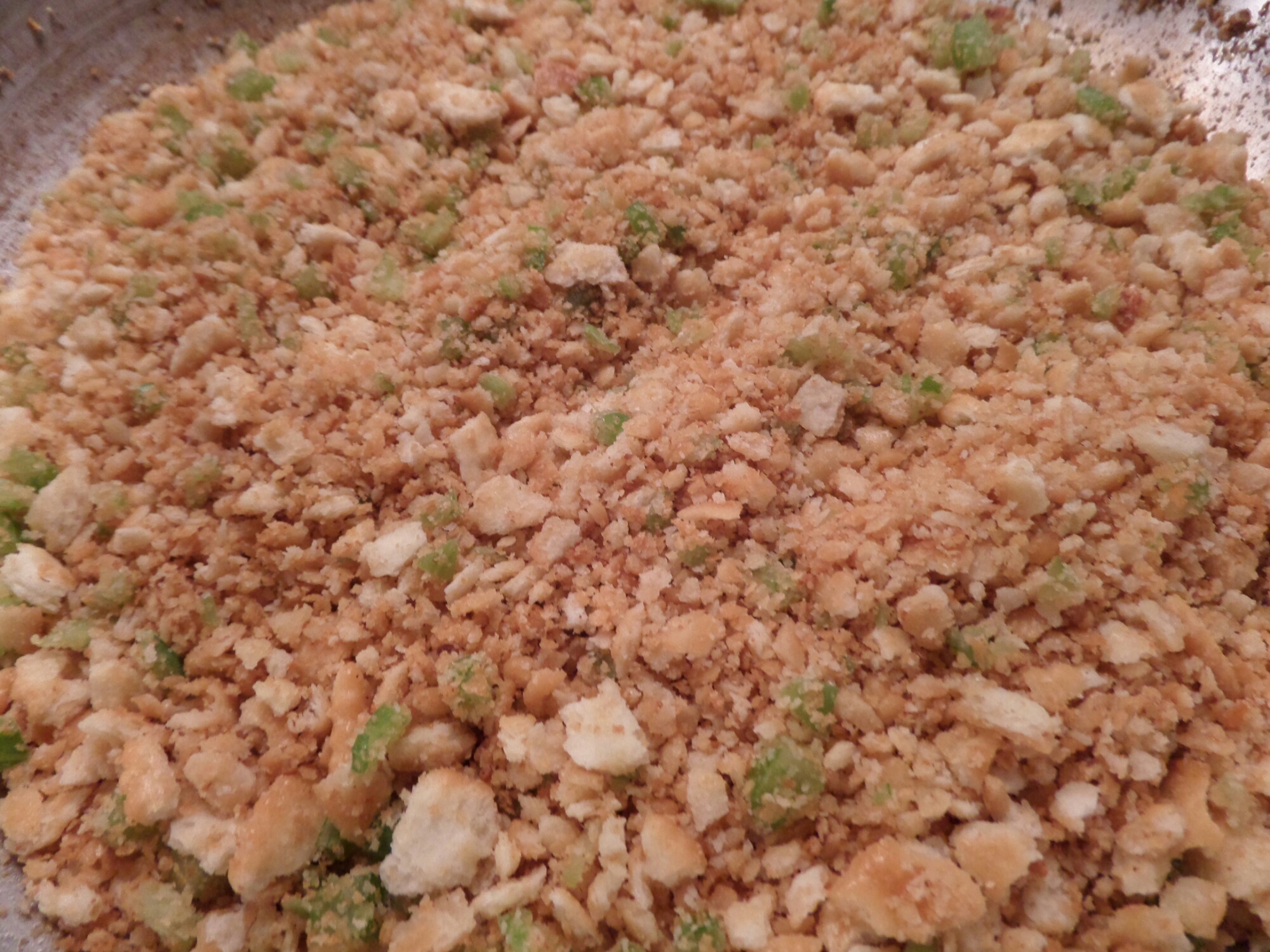 Now at this point, you could add a little mayo to the mixture to bind it. I chose a different method. I melted a few tablespoons of butter in a skillet. I added the breadcrumbs and celery. I stirred until all the butter was absorbed and the crumbs were starting to toast.