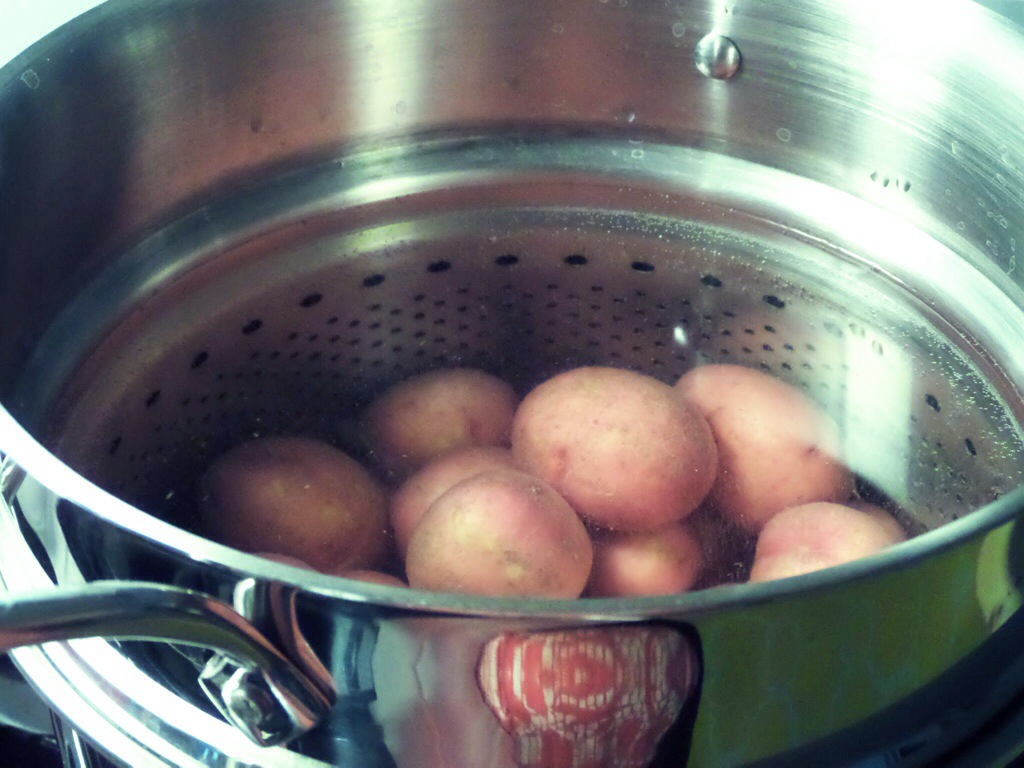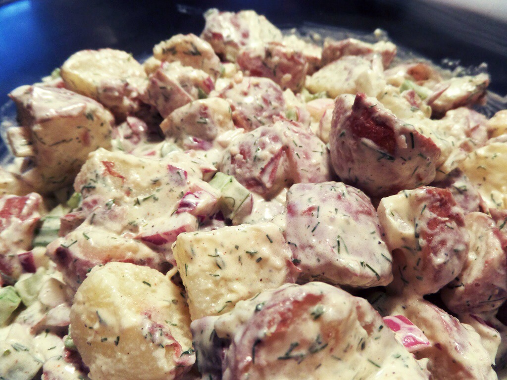So we’re at a friend’s for dinner the other night. He’s a single guy and I’d never experienced his cooking but when we arrived, there seemed to be a lot of action coming from that kitchen. An arugula salad was plated (he said it must be served at room temp….well ok!), a jam glaze was simmering on the stove, the grill was ready for the chicken thighs and there, before me, was a beautiful bowl of potato salad. I don’t even generally like potato salad but this looked delicious.