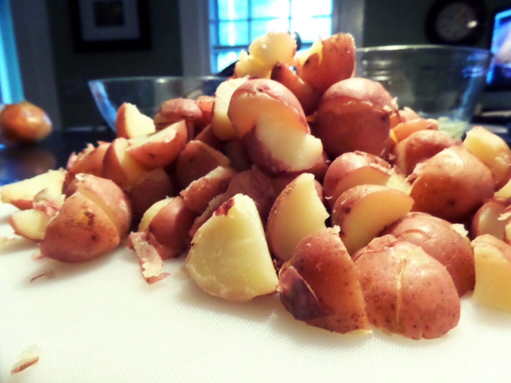 Once the potatoes are cool enough, cut them into small chunks. Since I was using small red potatoes, I just quartered them.