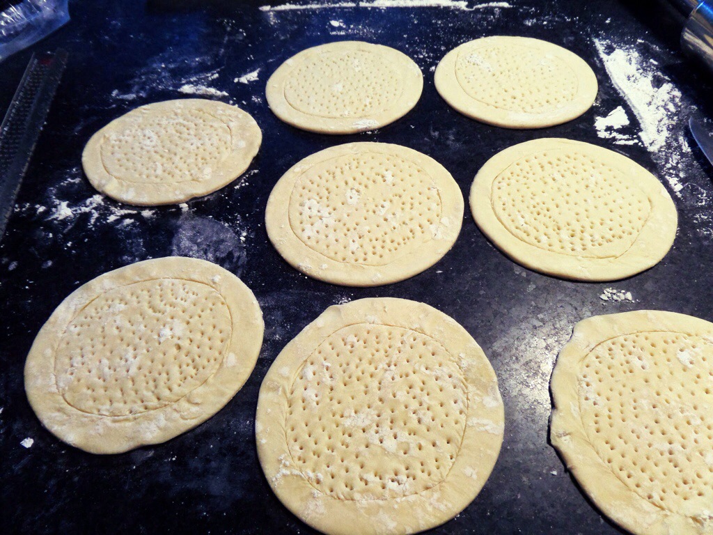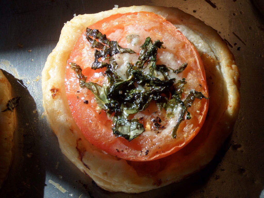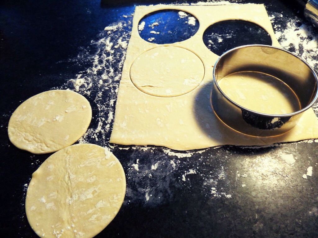 Take a small saucer or metal ring to make nice, even circles in the dough. With a six inch ring, I managed to make 8 small discs from the two sheets of puff pastry,