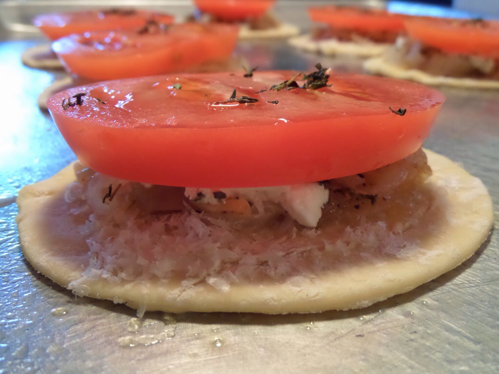 Spread the onion and garlic mixture, add the goat cheese (garlic and herb highly recommended), place a single tomato slice in the center, brush with olive oil, add shaved parm and top with basil.
