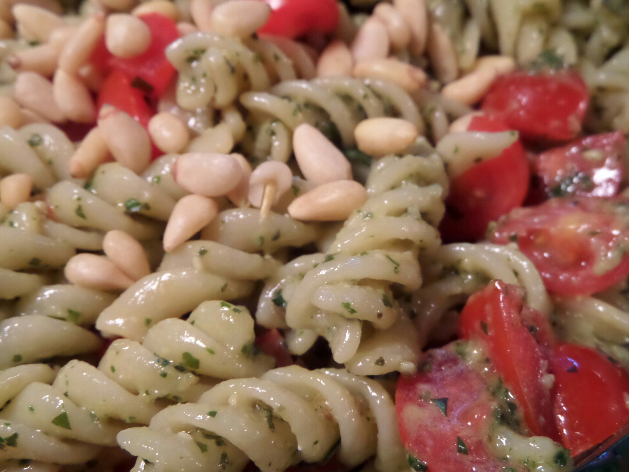 When the pasta has slightly cooled, add two beaten eggs, the reserved pasta water, a quarter cup of good olive oil, 2 cups of pesto, a packed cup of chopped basil, a quarter cup of mint, a cup of Parmesan cheese , a quarter cup of pine nuts, salt and pepper to taste and finally, 3 cups of quartered grape tomatoes.