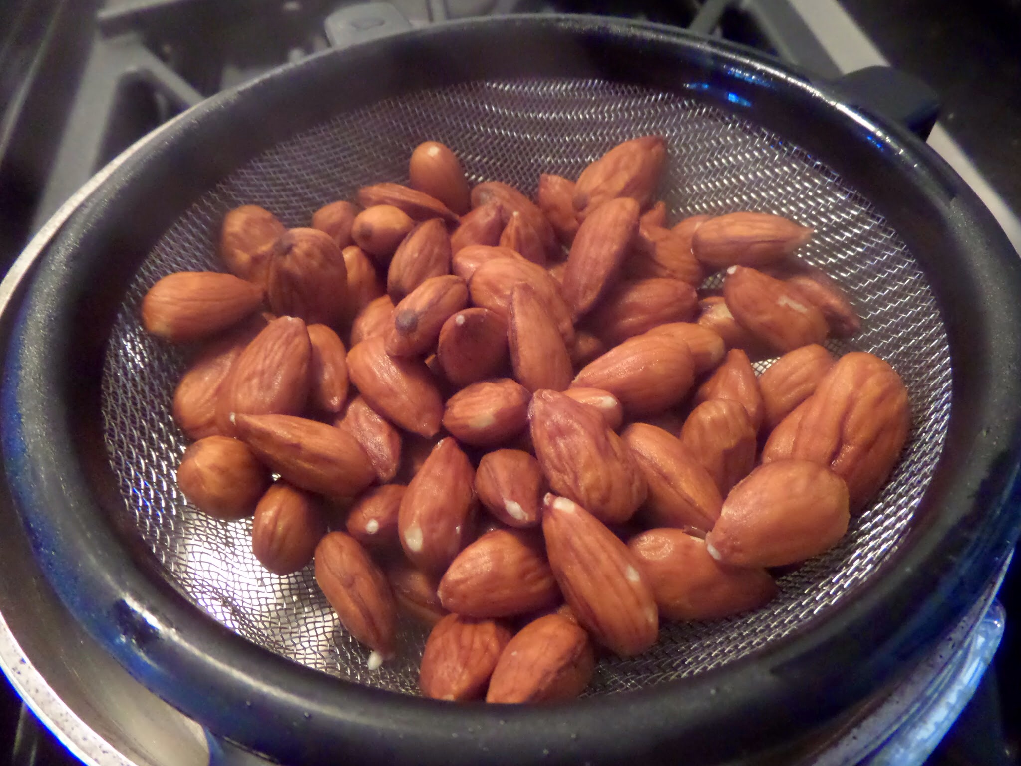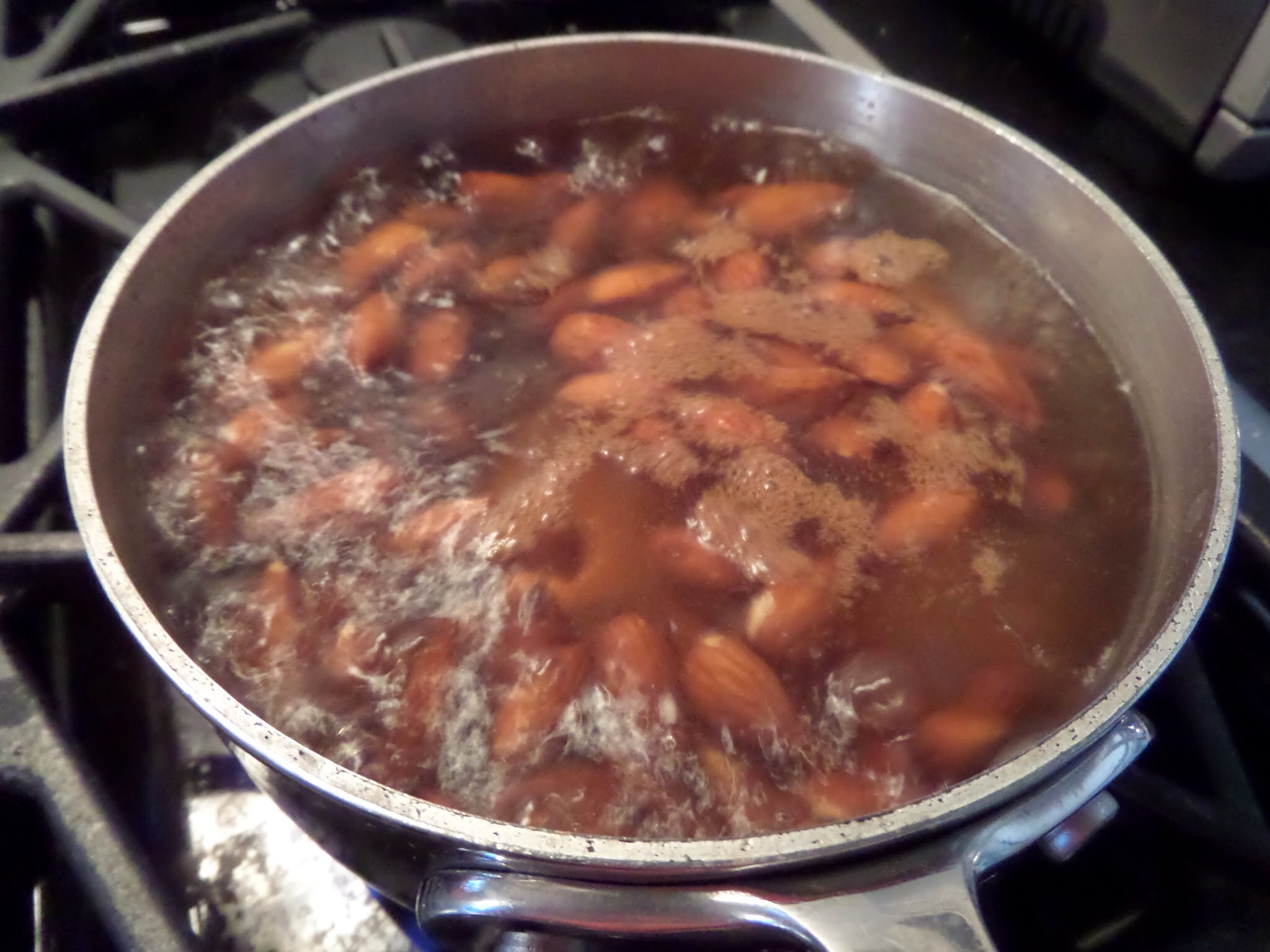 Get a pot of water boiling and add the almonds. Only boil them for about 60 seconds. Strain them and the skins should fall right off.