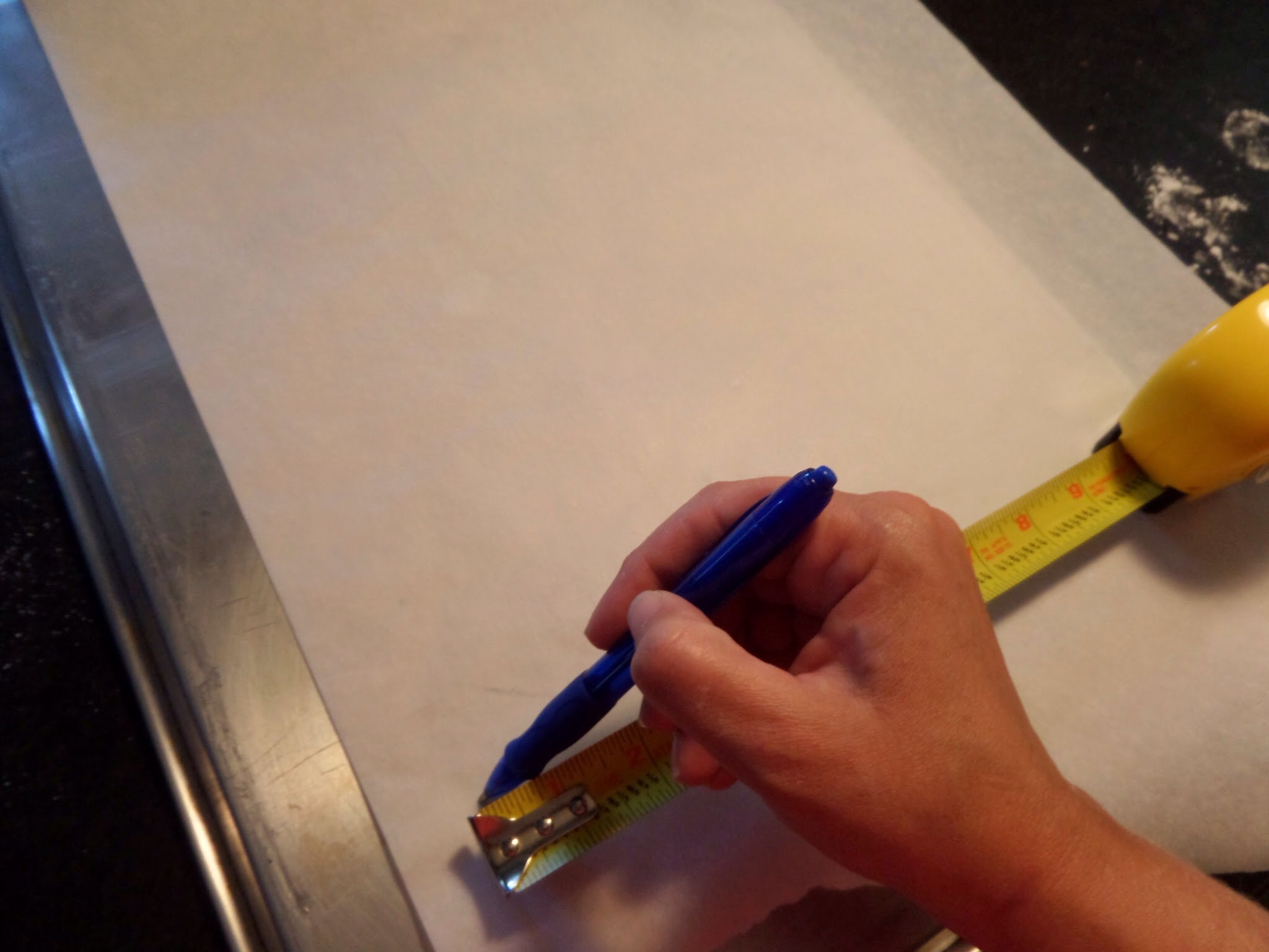 3. Adjust oven rack to middle position and heat oven to 250 degrees F. Using ruler and pencil, draw 13 by 10 1/2-inch rectangle on piece of parchment paper. Grease with butter, a large, flat baking sheet without sides (or upside down baking sheet) and place parchment on it, ink side down. Grease top of parchment with butter.