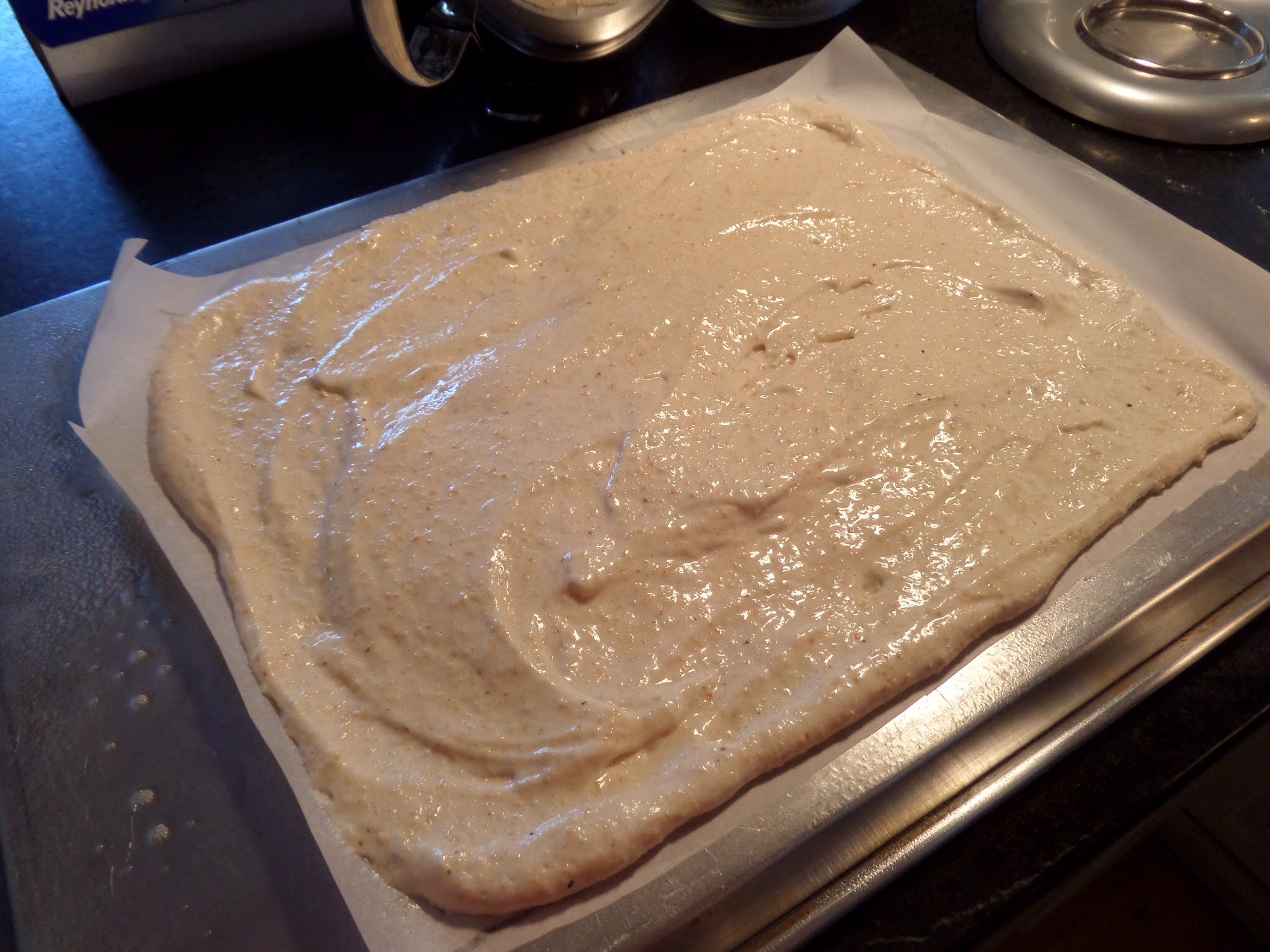 5. With offset spatula, spread meringue evenly, and gently, into the 13 by 10 1/2-inch rectangle on your parchment-lined baking sheet, using lines on parchment as guide.