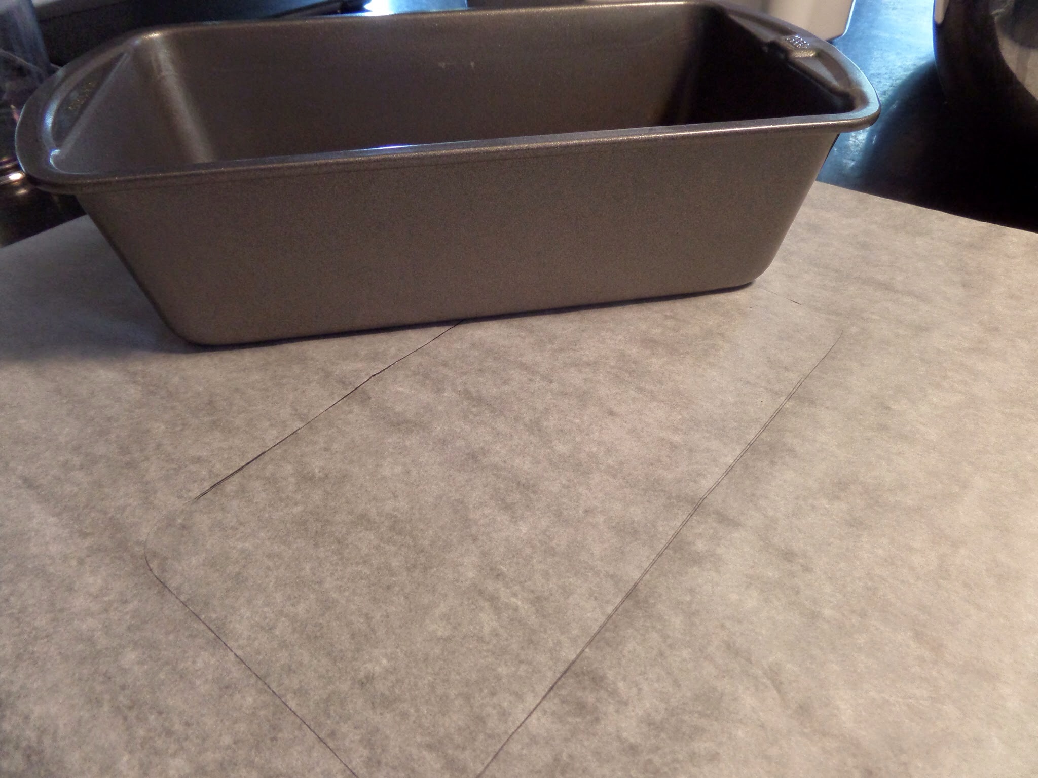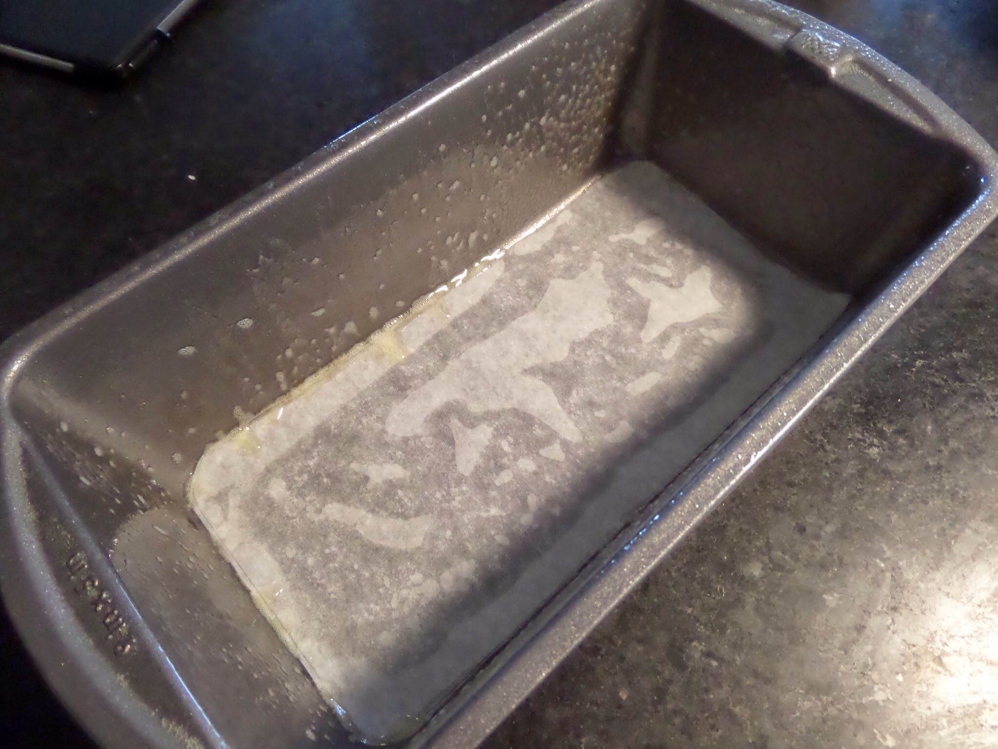 Preheat the oven to 350 degrees F. Grease an 8 1/2 by 4 1/4 by 2 1/2-inch loaf pan. Line the bottom with parchment paper. Grease and flour the pan.