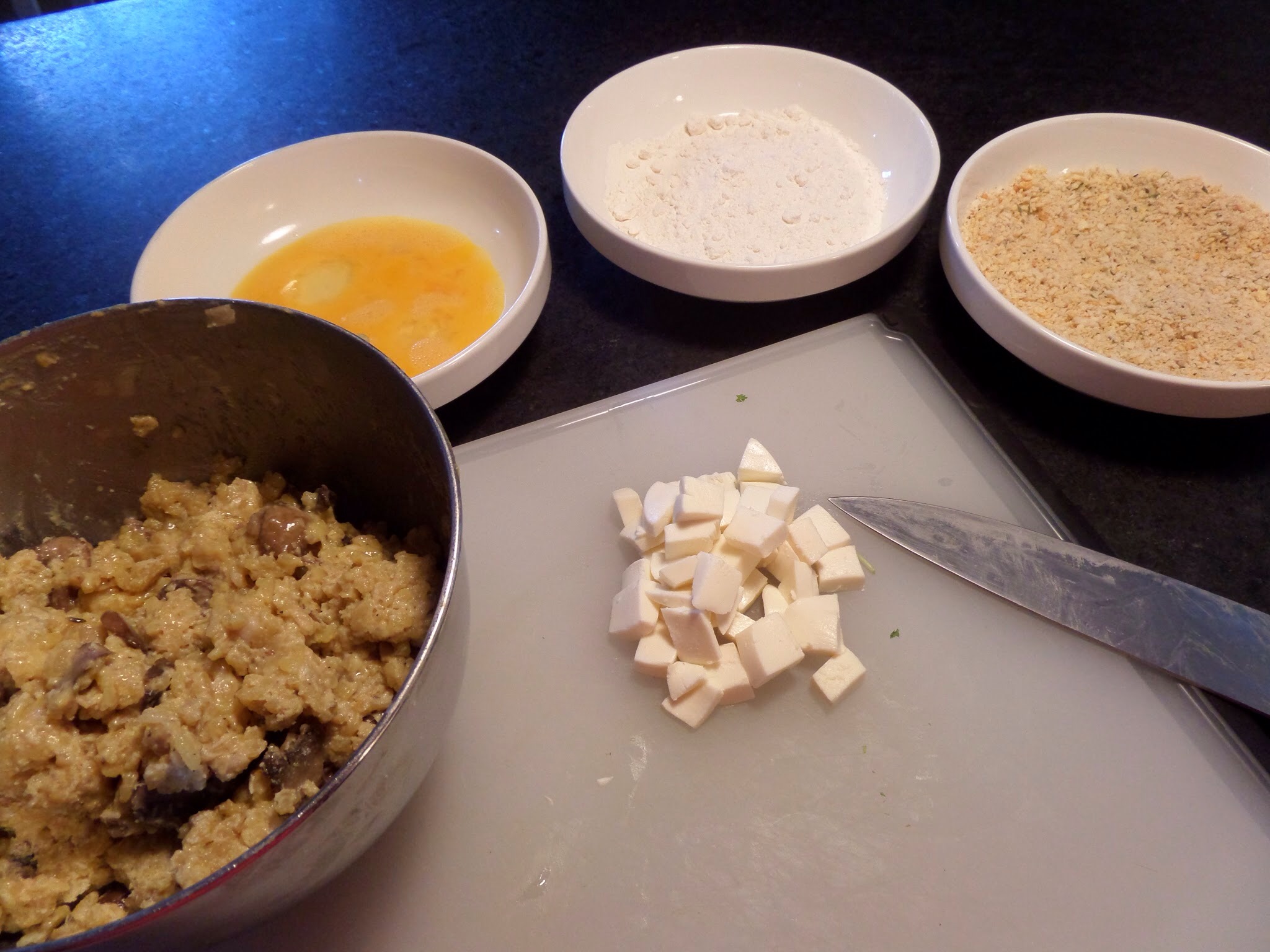 Next, whisk a couple of eggs in a bowl. In another bowl, add 2 cups of flour. In a third bowl, add 2 cups of breadcrumbs. I used a mixture of panko and traditional Italian breadcrumbs. Lastly, dice some fresh mozzarella (preferably low moisture) into 1/2″ cubes. You’ll want a cube per arancini. Time to start rolling!