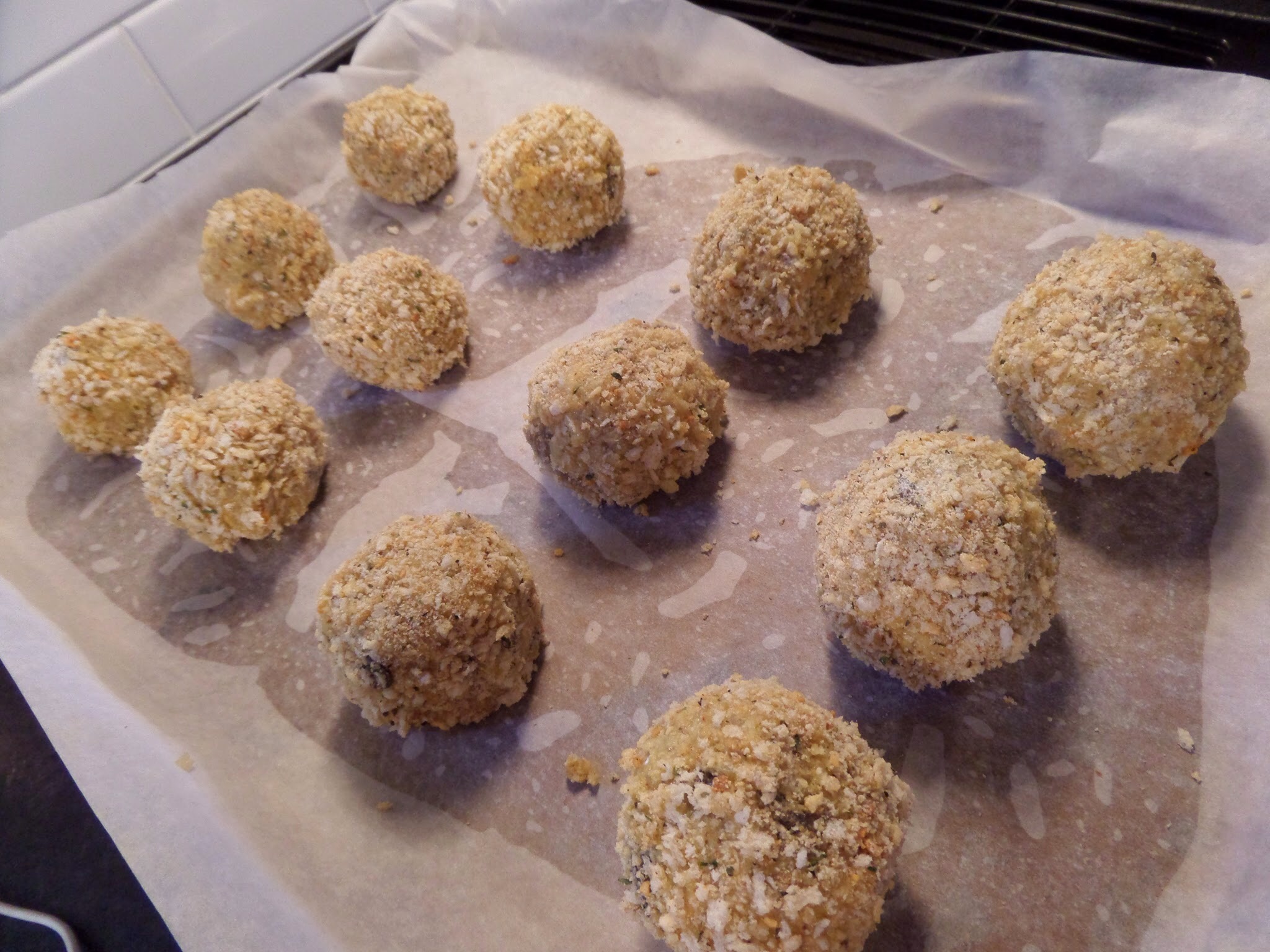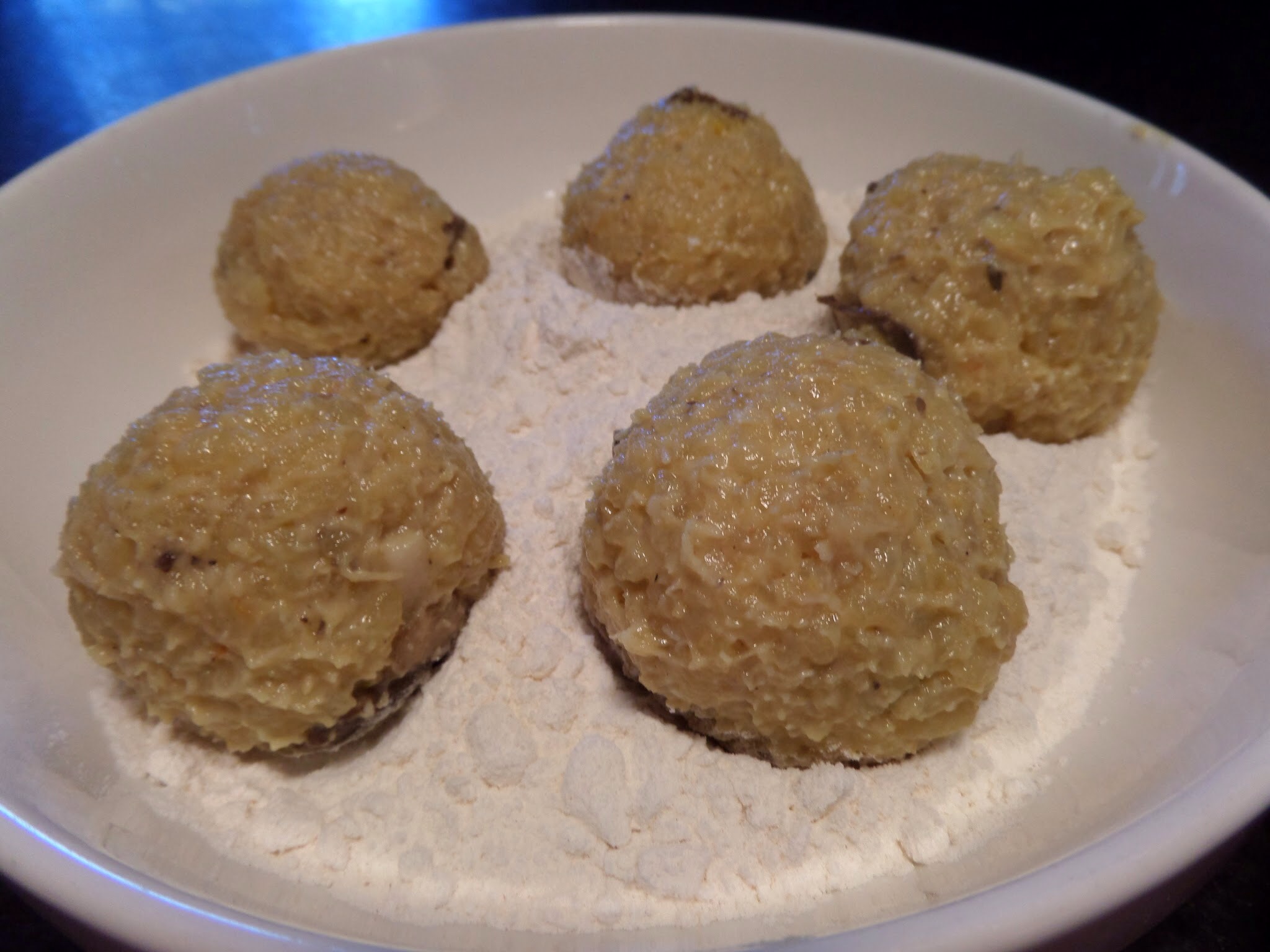 Take 2-3 tablespoons of the risotto and roll it into a ball in your hands. Poke a hole into the center and add a piece of cheese. Roll some more to be sure you’ve covered the cheese up.
