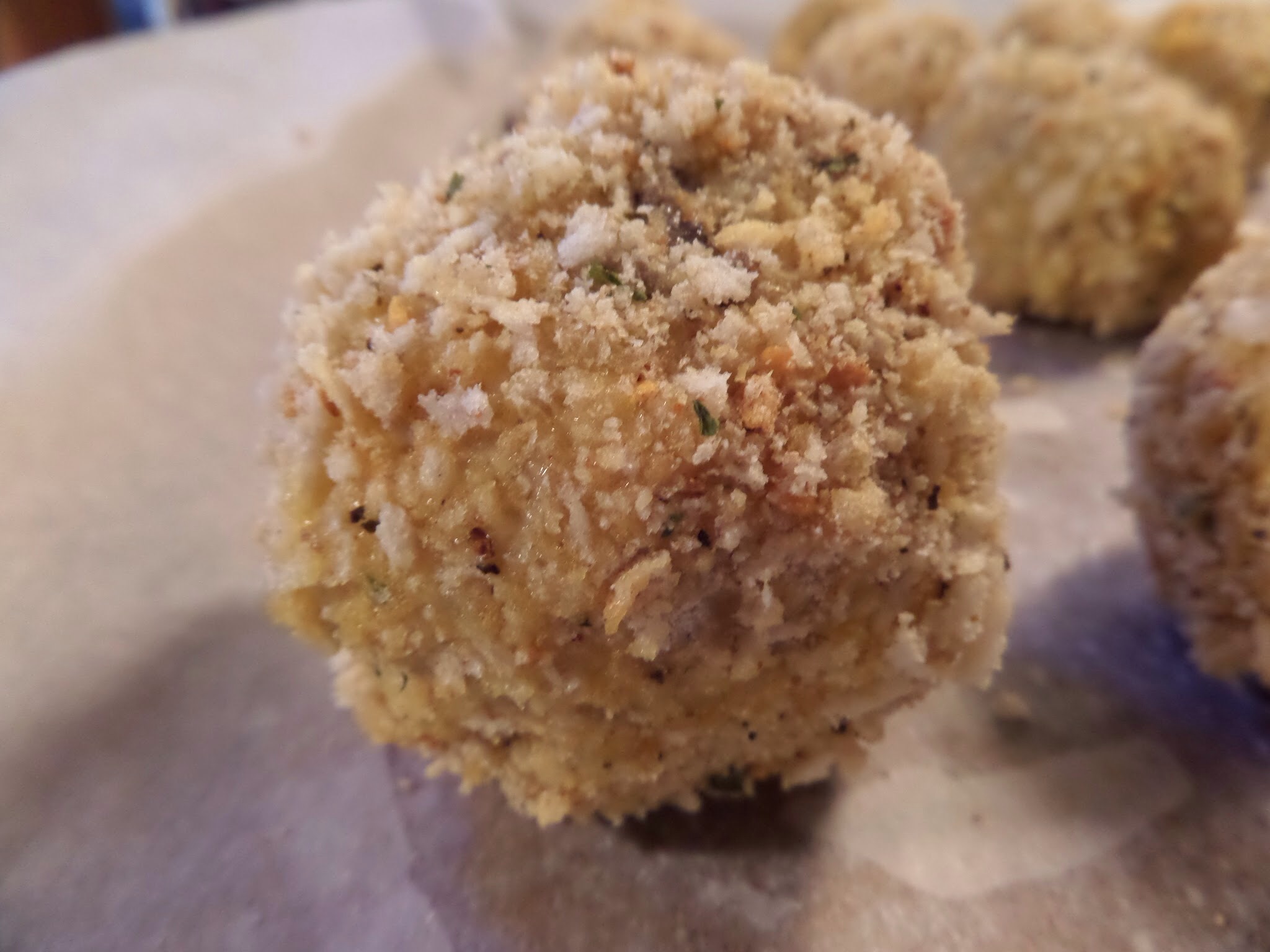 Also, I’d recommend cutting back the amount of cremini mushrooms or dice them, finely, before adding them to the risotto. It made rolling the risotto into calls much easier the next day.