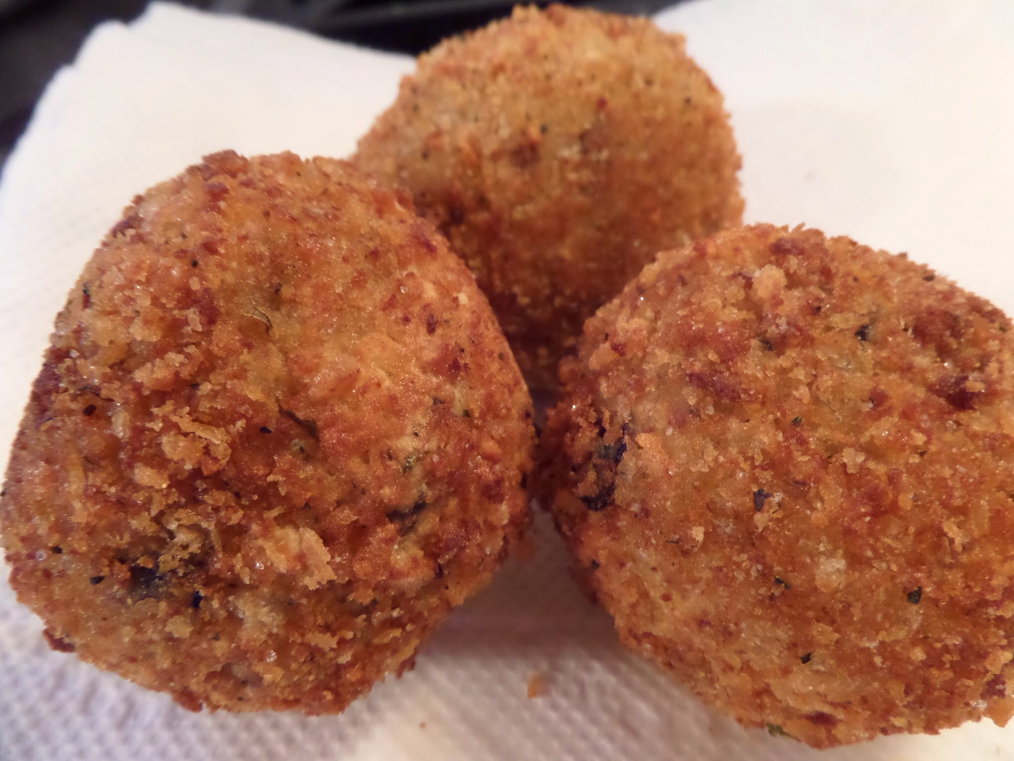Working in batches, slowly lower the risotto balls into the oil, using a slotted spoon or a spatula. Don’t overcrowd the pan! The oil temp will drop too quickly and there go your little masterpieces.