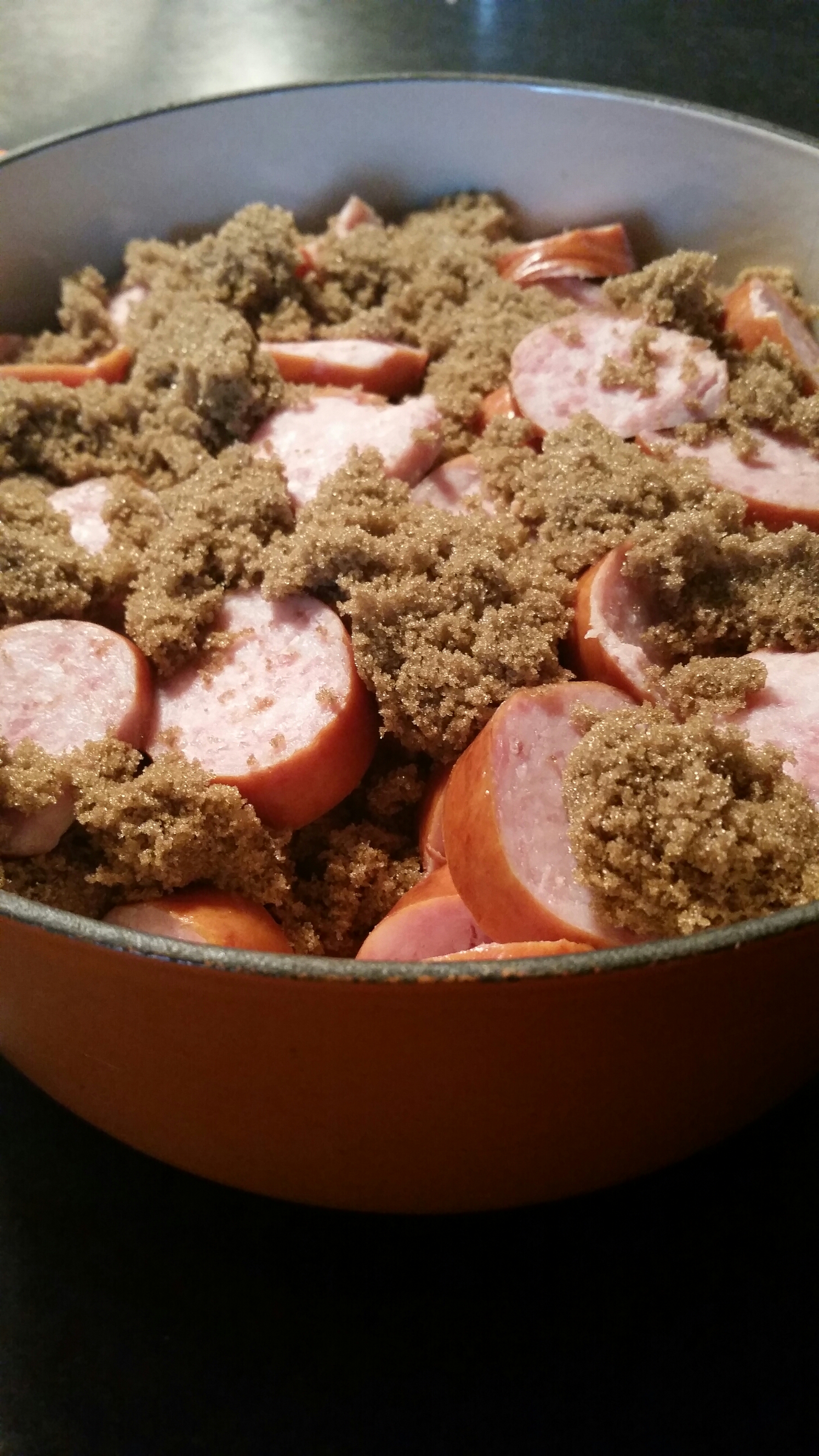 Bake for 45 minutes at 325° until the kielbasa has a nice coating of caramelized sugar.