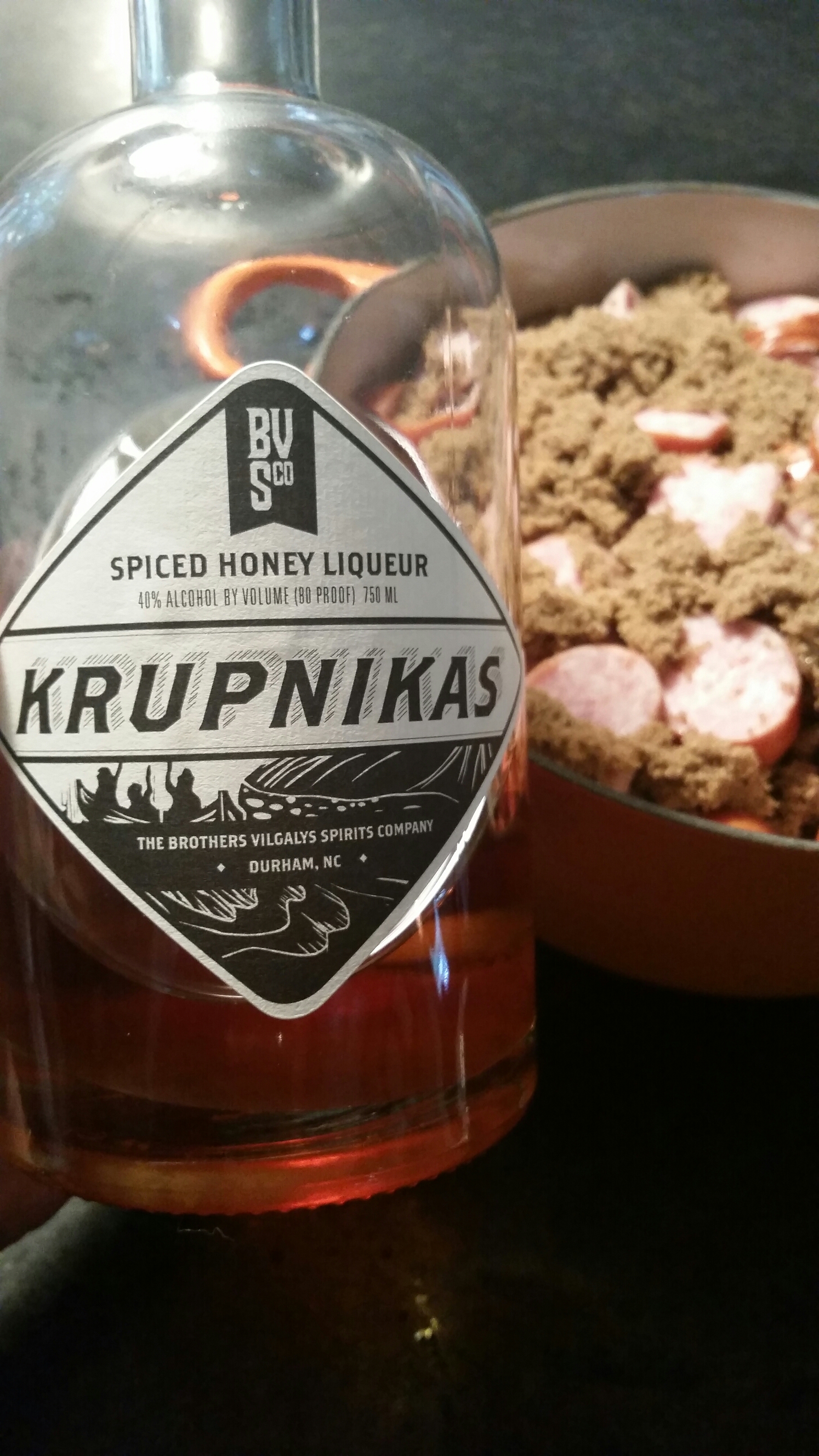 Slice the kielbasa 1/4” thick. Layer it in a deep backing dish. Sprinkle the brown sugar between the layers and pour the liquor over the top (optional).