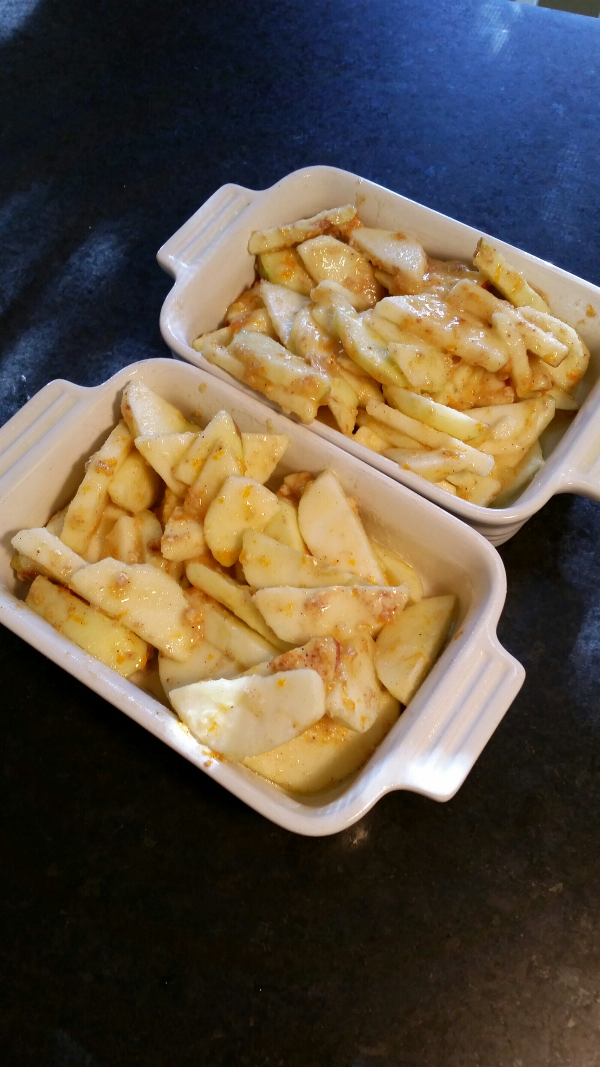Peel, core, and cut the apples into large wedges. Combine the apples with the zests, juices, sugar, flour, and spices. Pour into the dish.