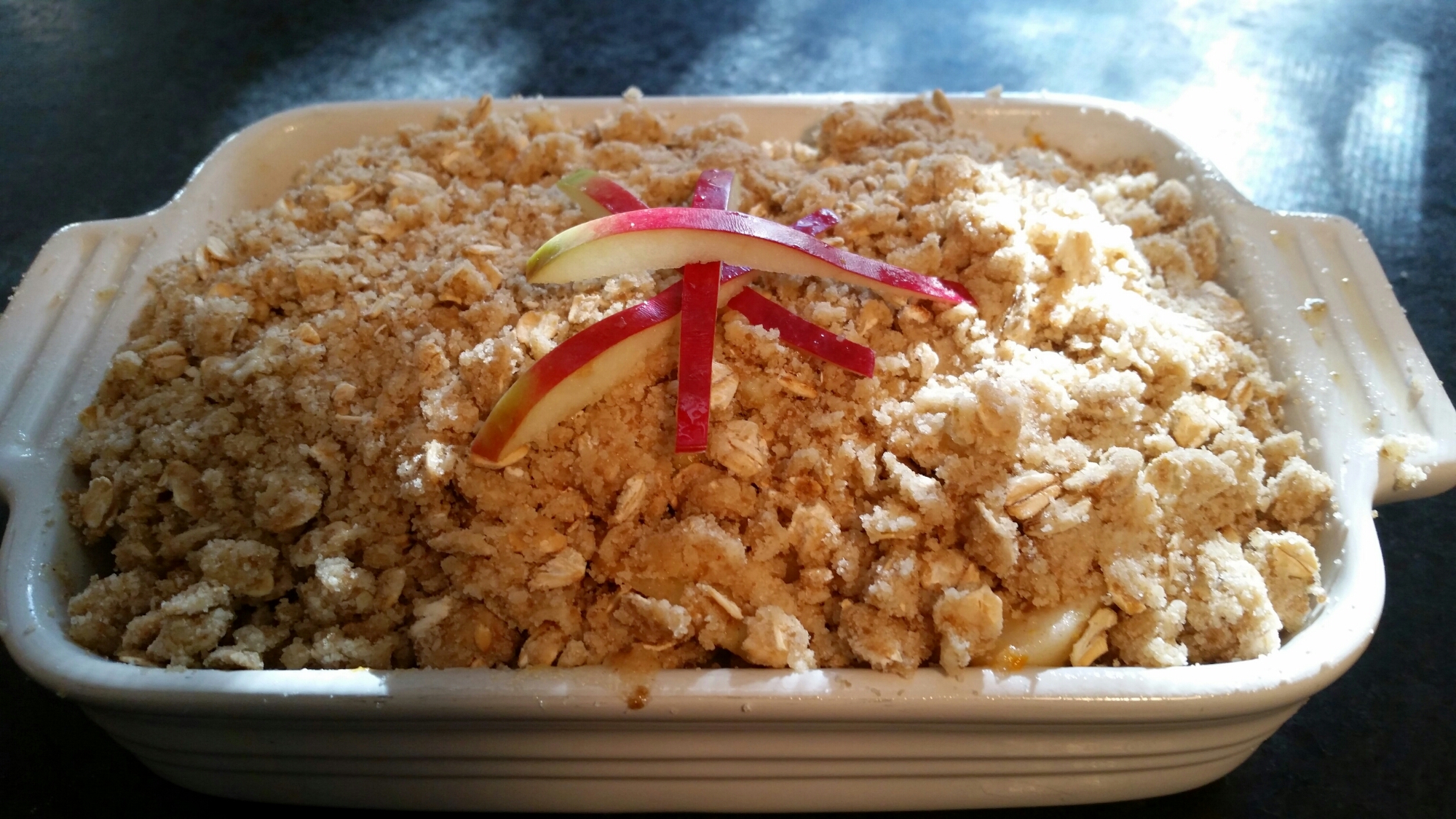 My love of all-things-Ina led me directly to her site. I made a couple of mistakes…. I left the peel on the apples and I added too much juice from the orange. Oh it still tasted amazing but I prefer a thicker filling. To make this extra special, I added a couple of tablespoons of flour. It helped make the innards gewy. Perfectly gewy!!