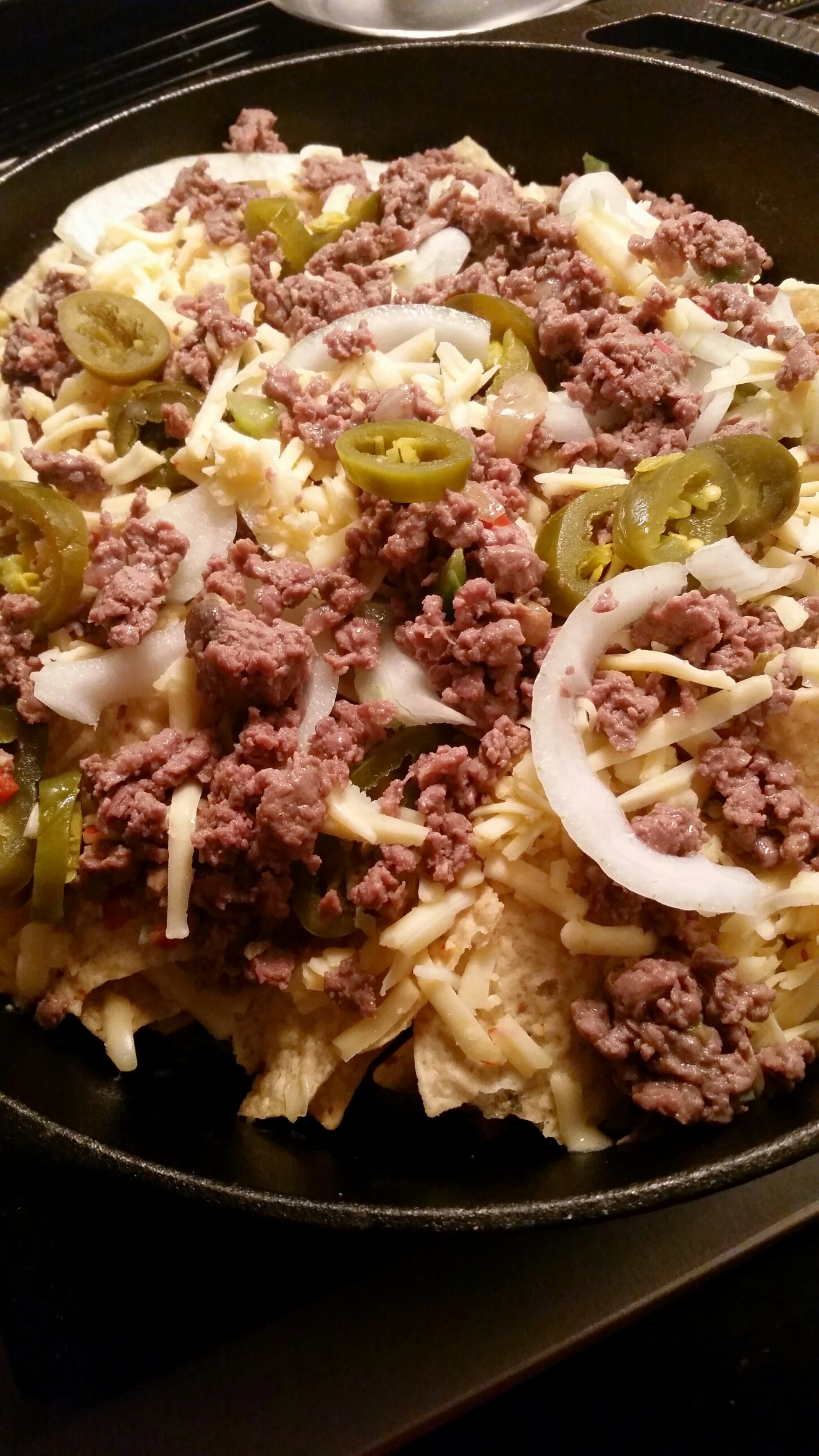 Have a cast iron skillet and not sure what the hell to do with it?! Nachos! Stevo has been craving nachos for days so he picked up some homemade sausage from our local butcher and it was game on.