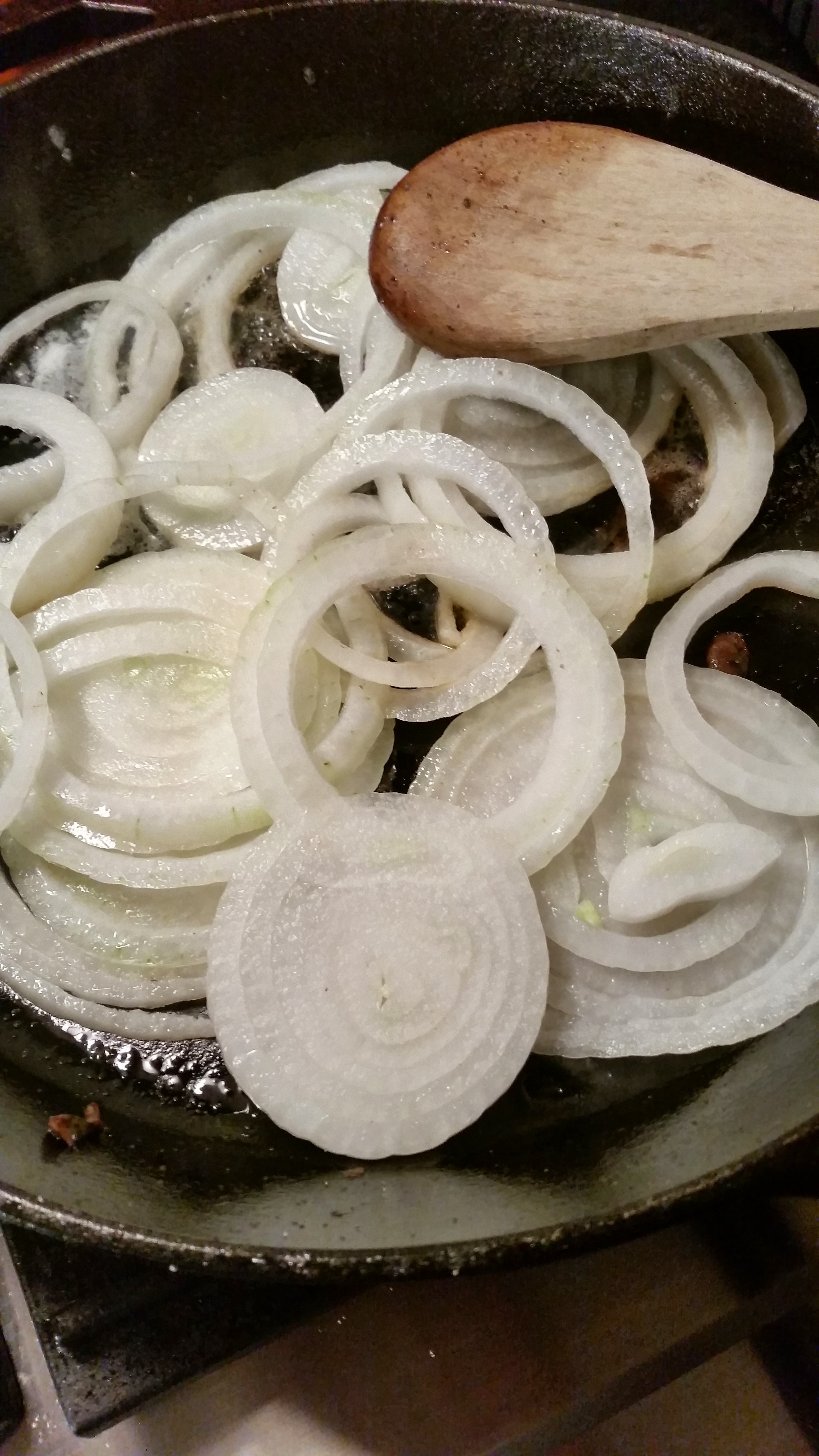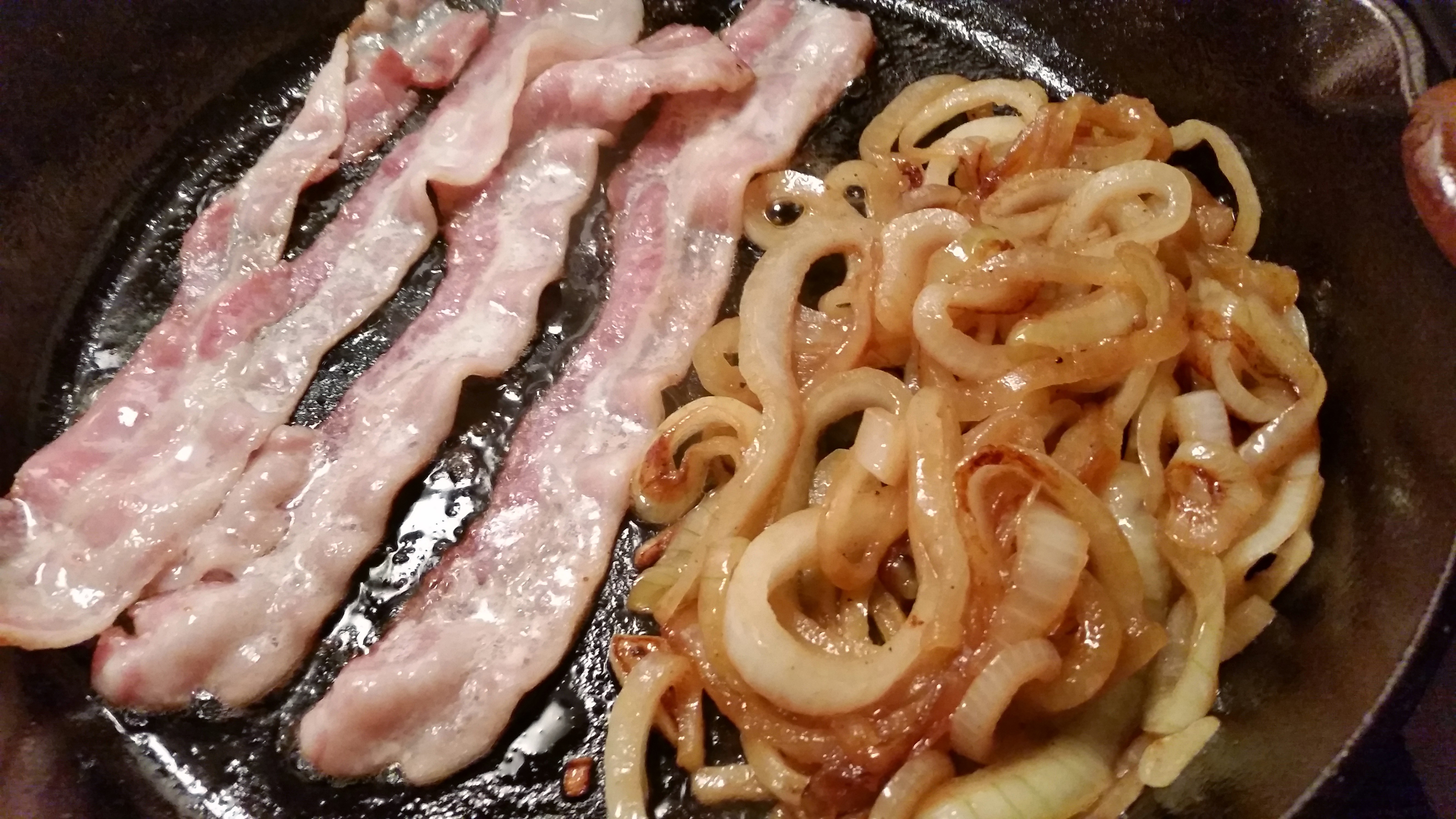 Next come the onions. Caramelizing them in the pan used to cook the bacon and mushrooms is heavenly. You may find that the mushrooms absorbed a lot of the fat so if the pan is getting dry, add a few more strips of bacon.