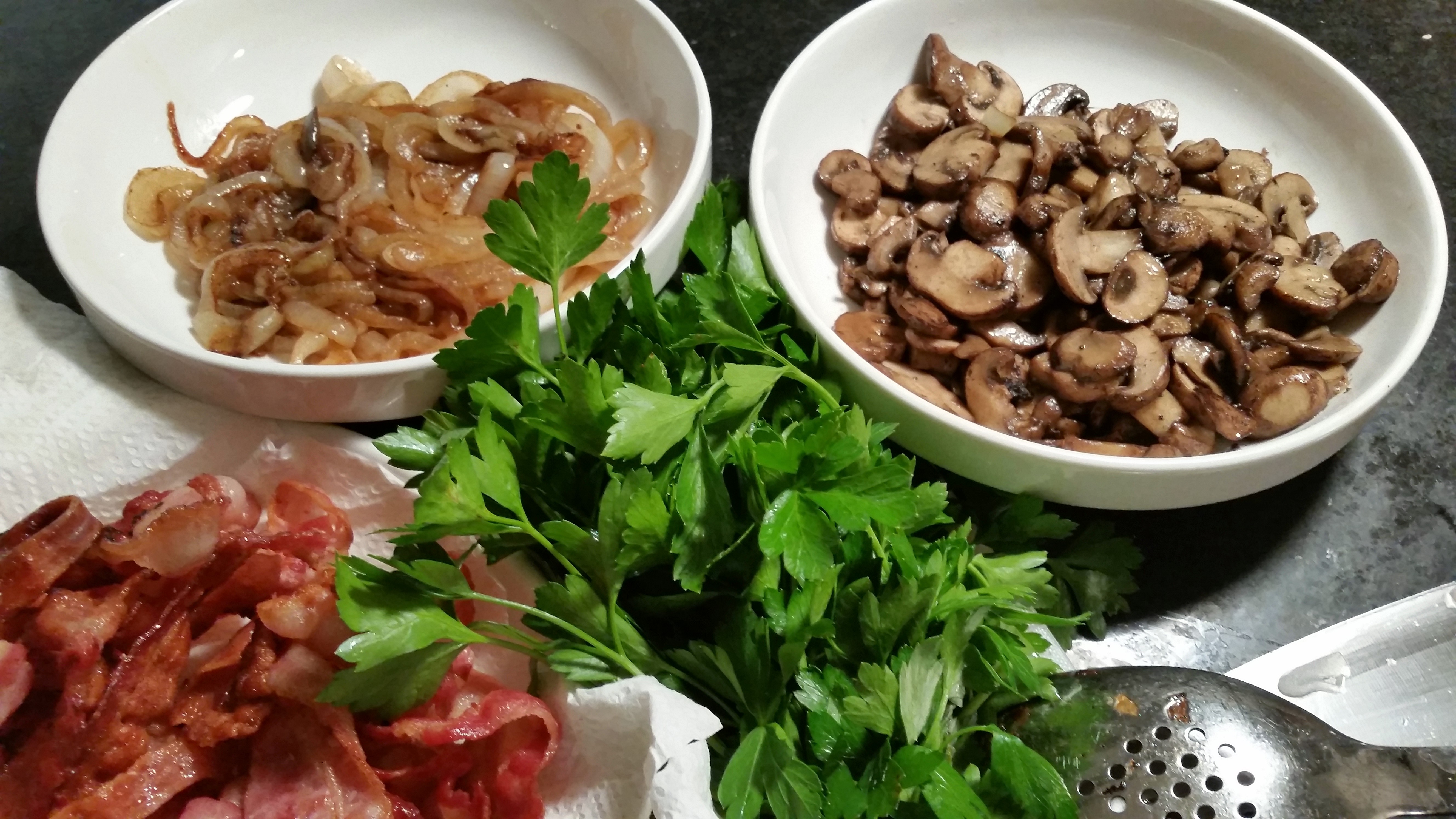 Chop the onions, mushrooms and bacon, when cooled.