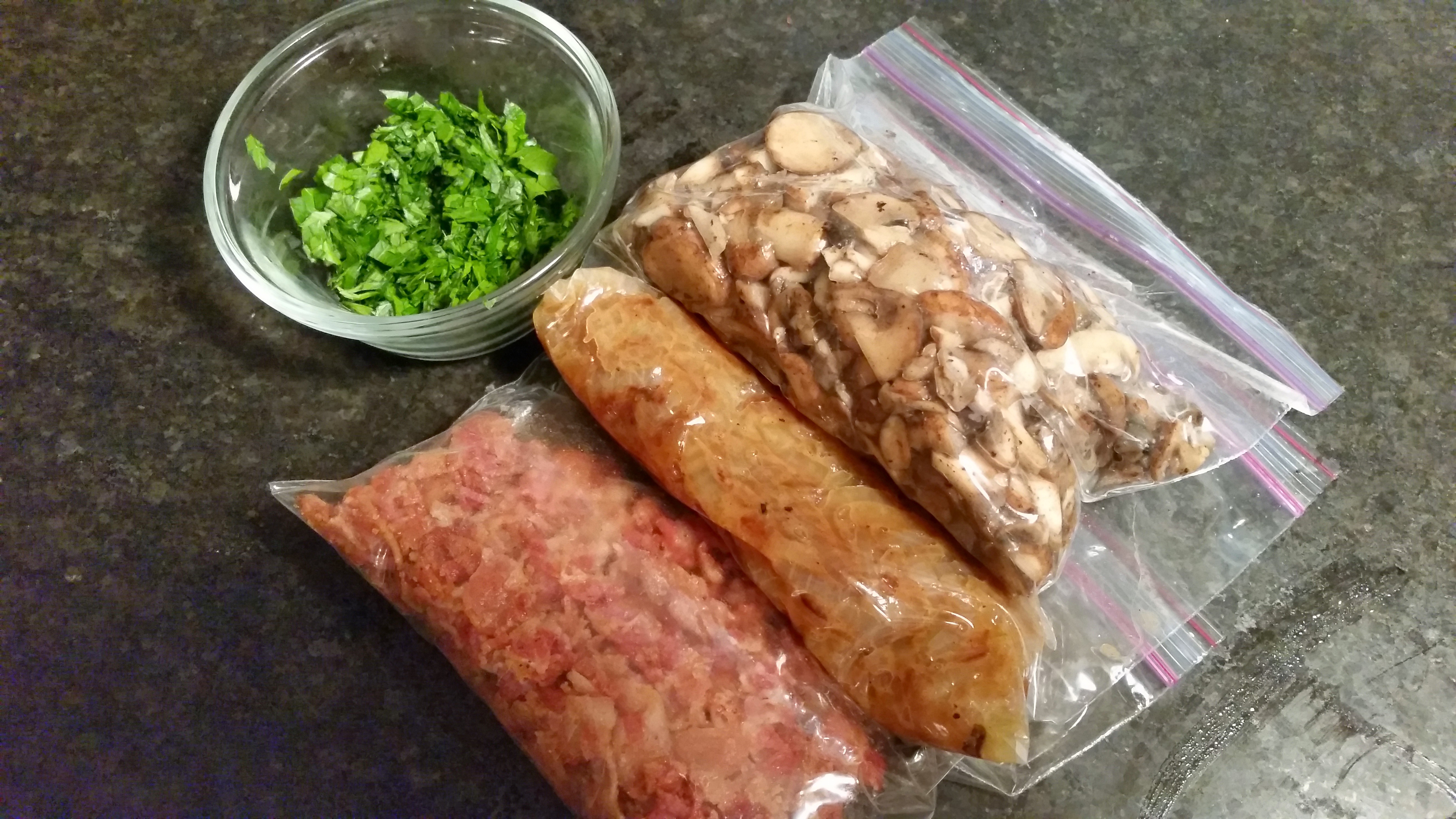 Once the three main components are finished, it’s time to prepare the sour cream, chop some Parsley, grate the parm and pack everything up.