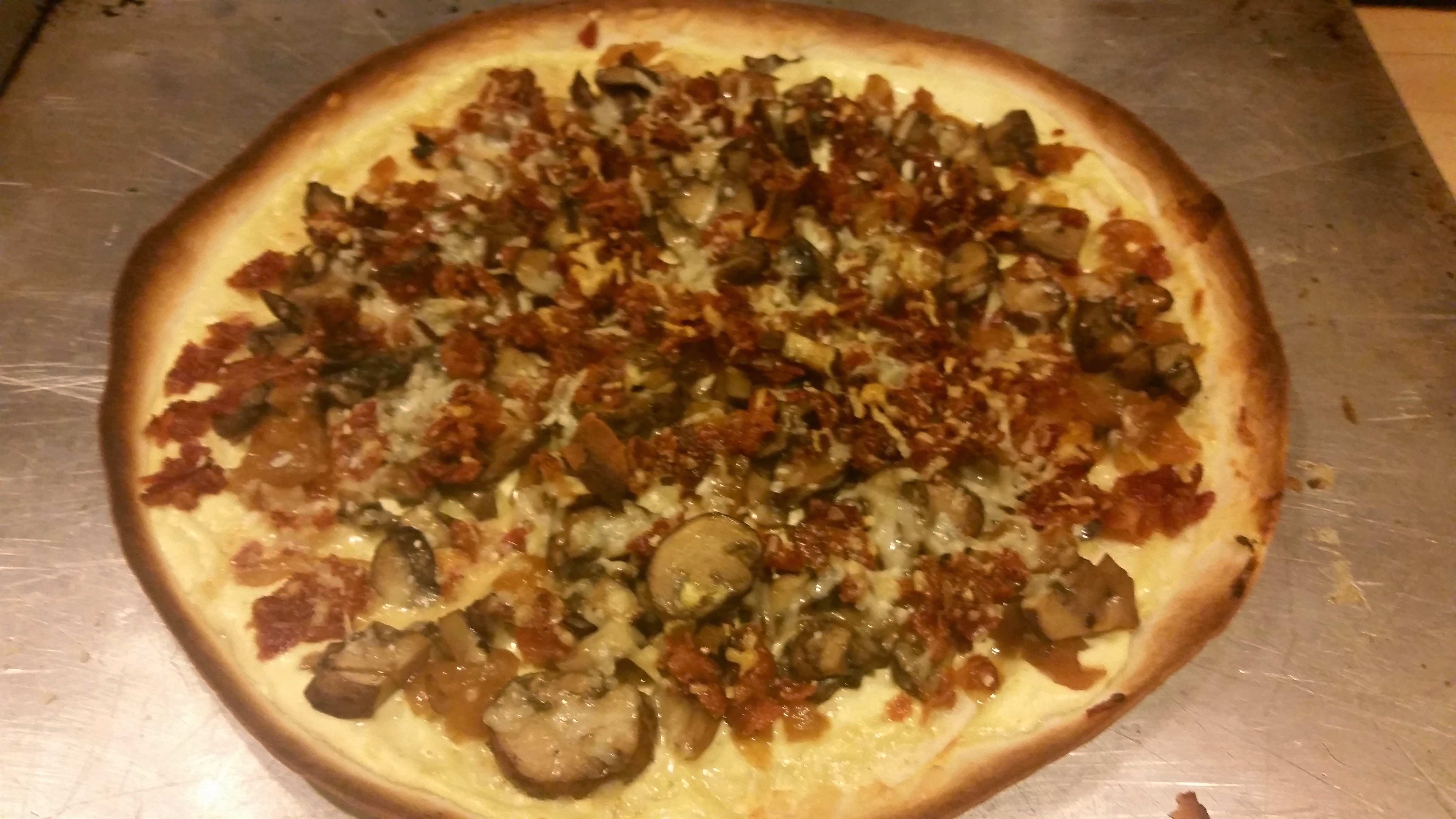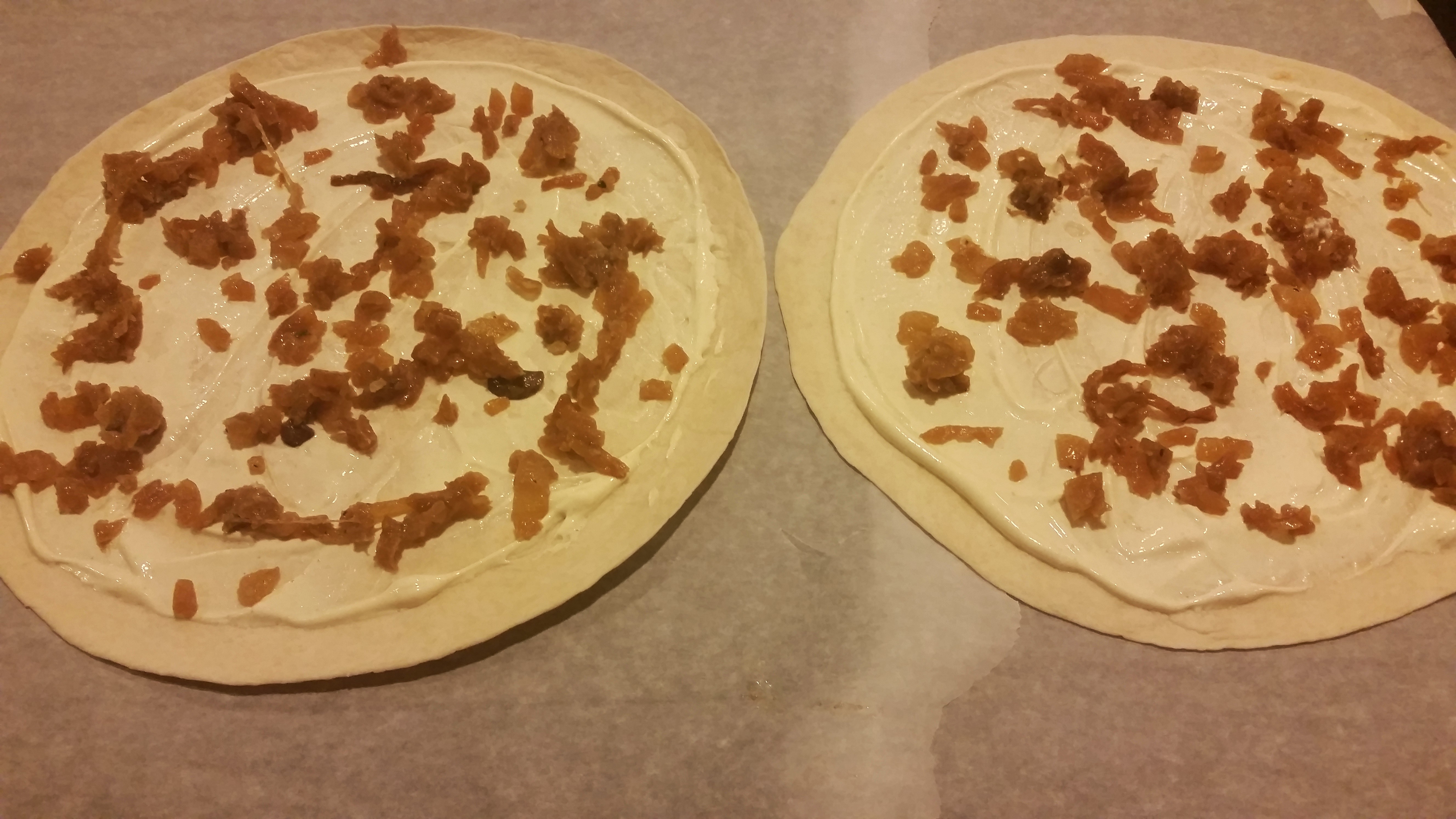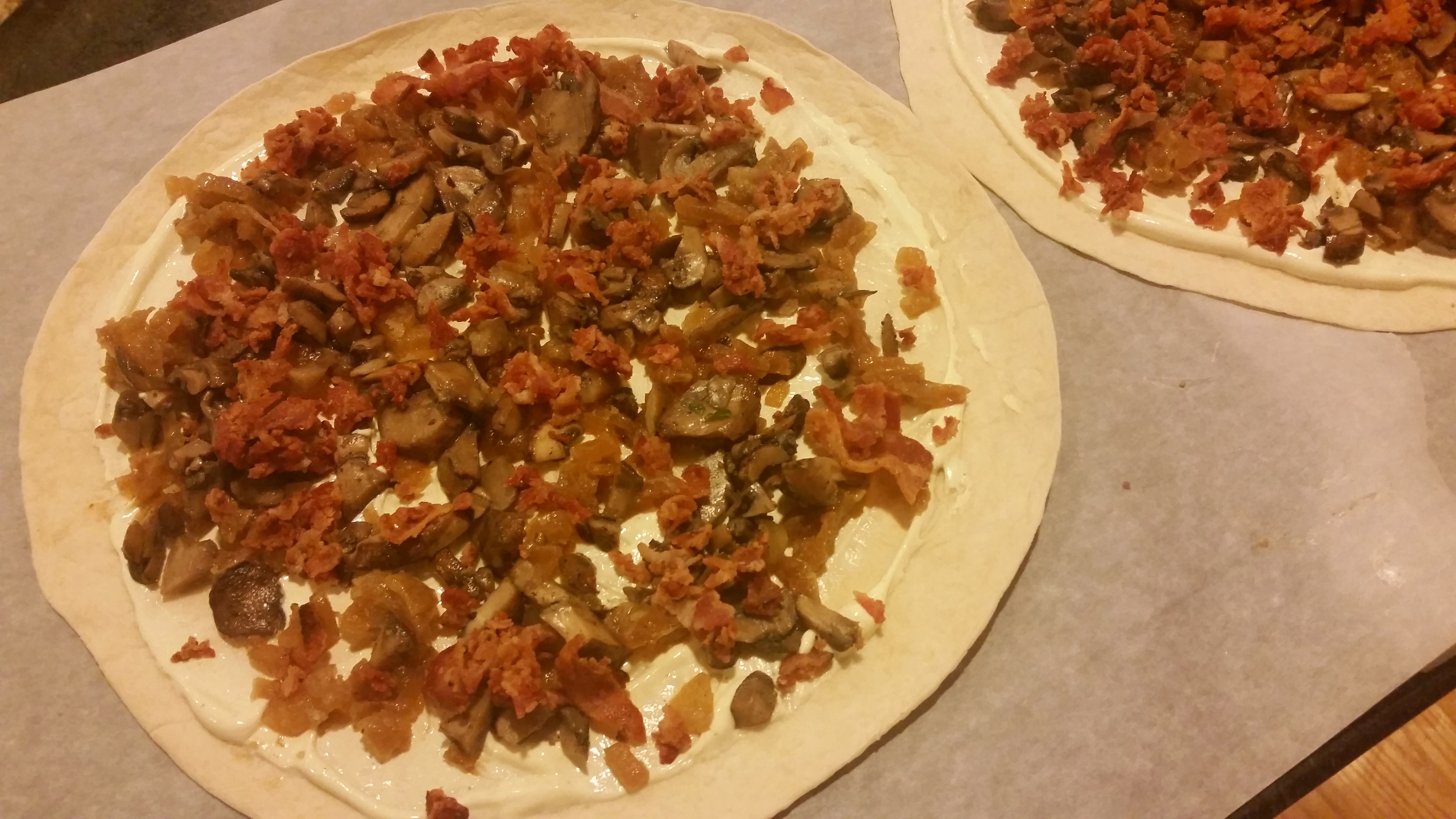 Spread the sour cream like you would a red sauce for pizza. I generally start with the onions and then layer on the mushrooms, bacon and parm.