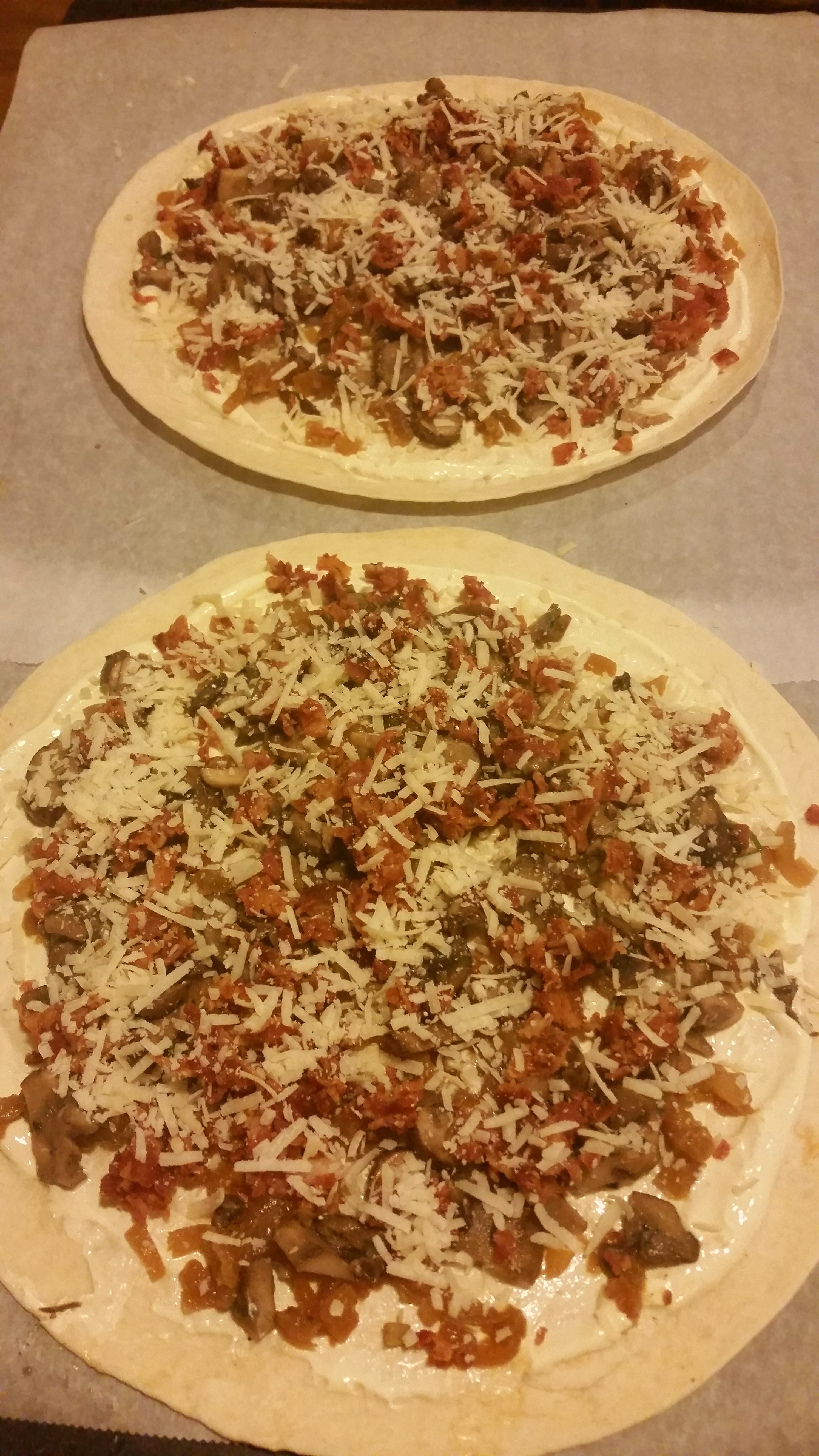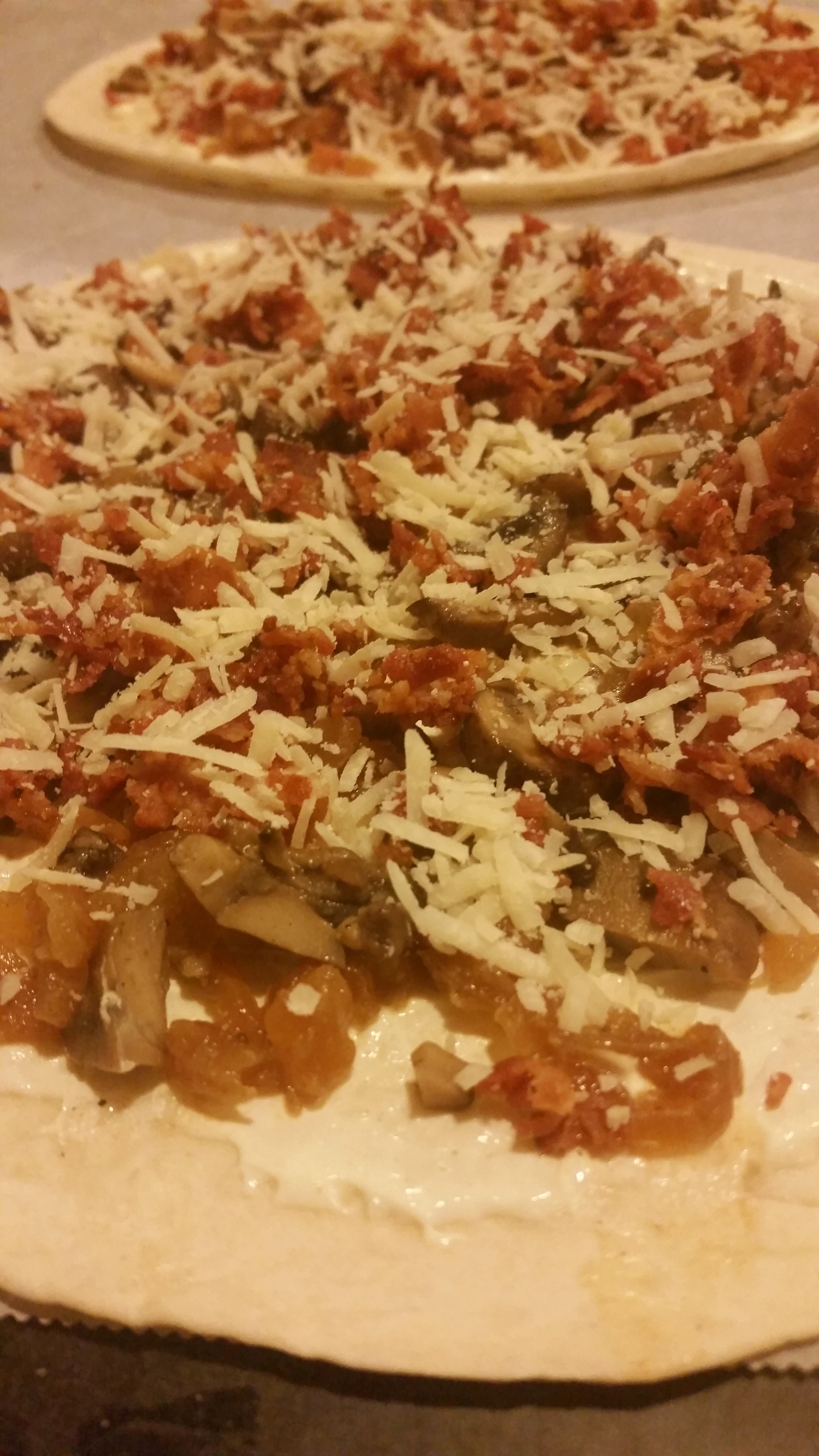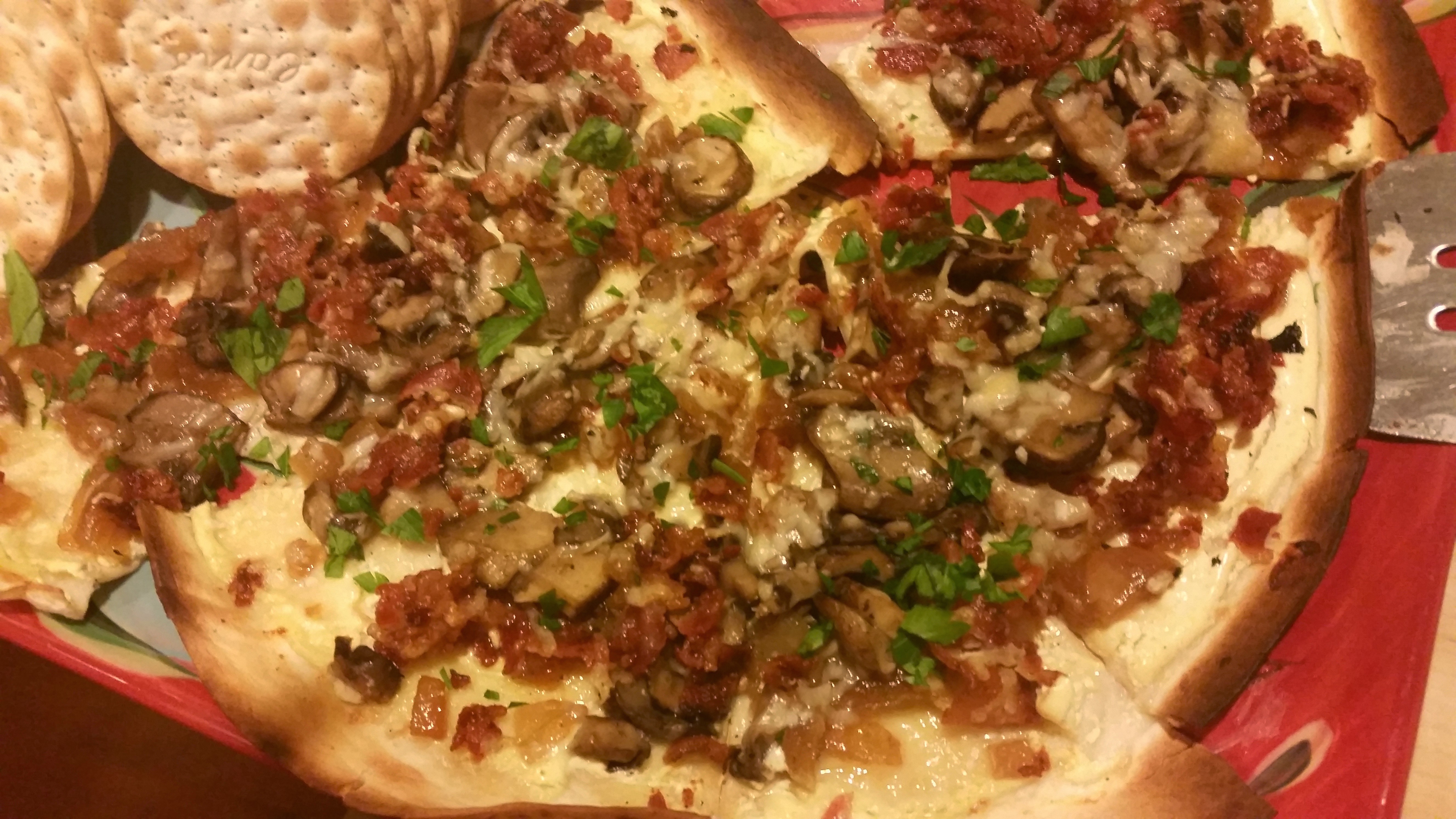 Sprinkle the sour cream with the onions, mushrooms, bacon and top with grated parm.