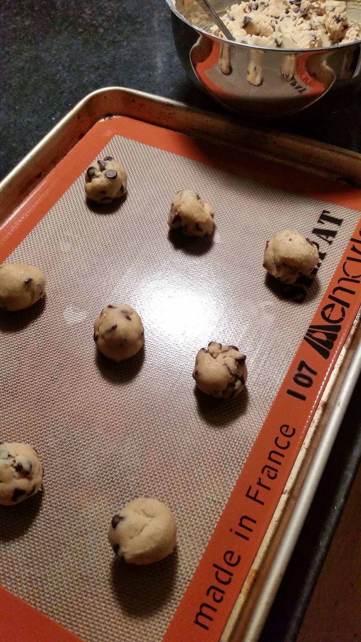 To get each cookie the same size, you just roll the dough into small balls, using your palms.