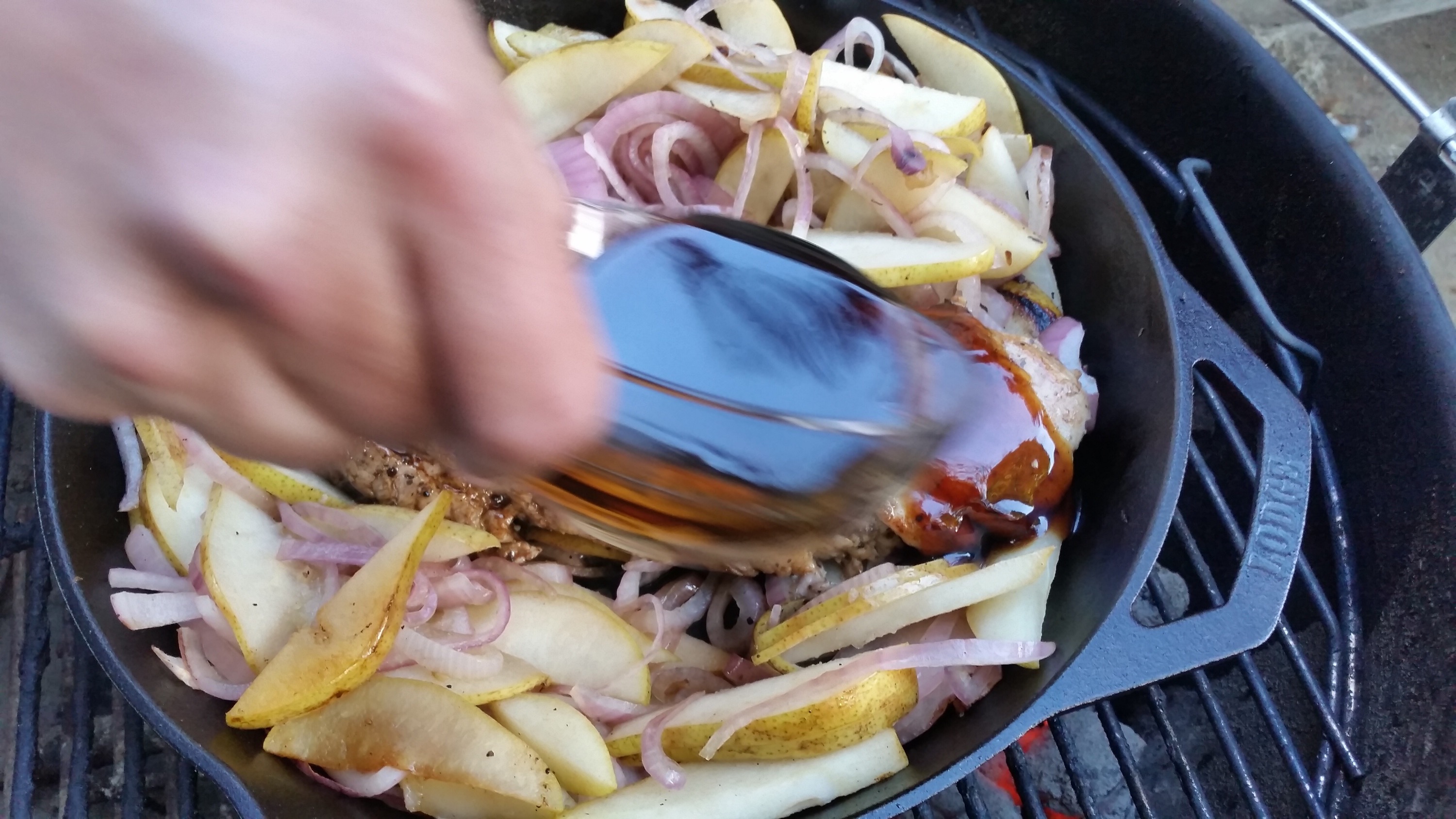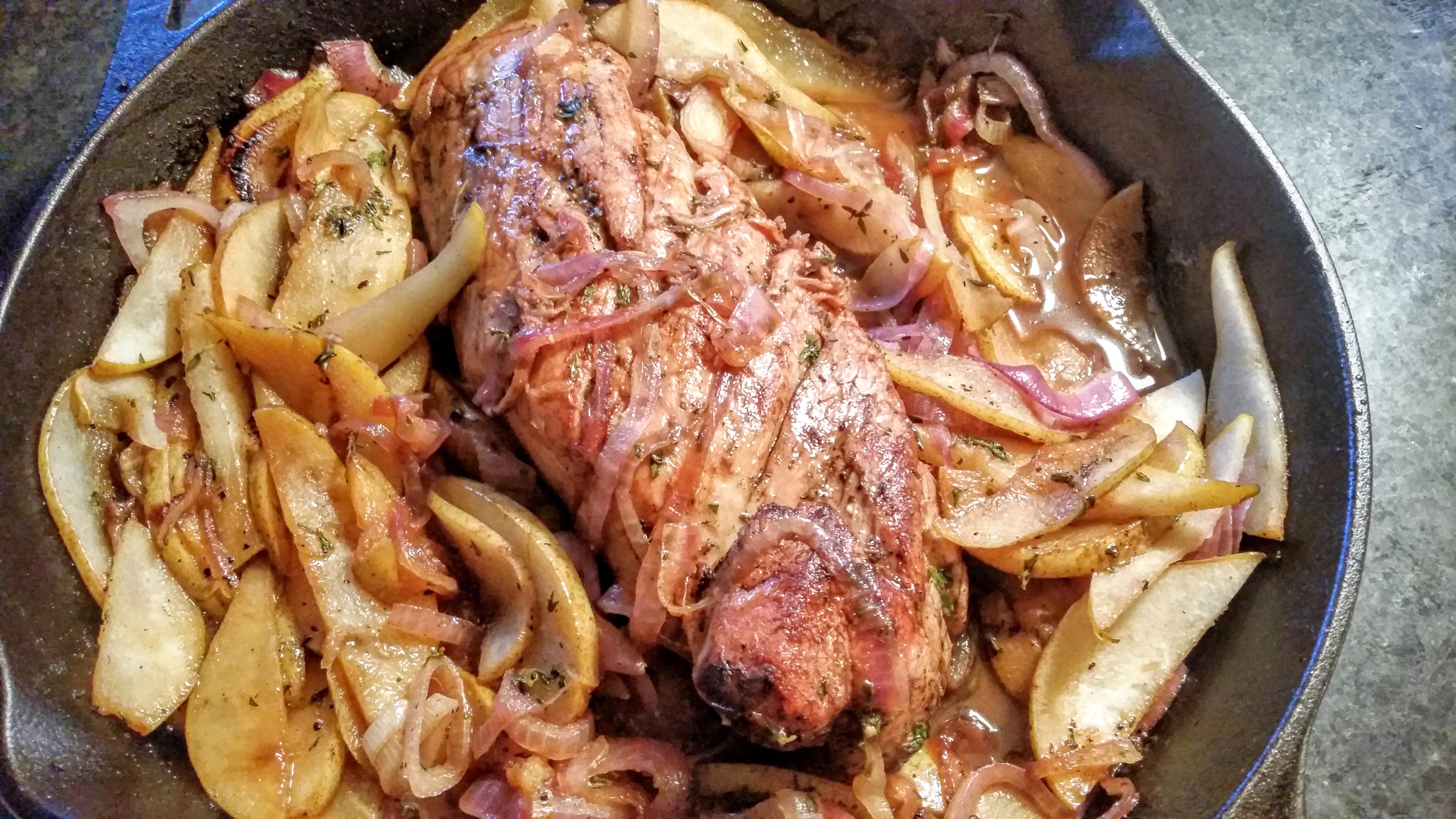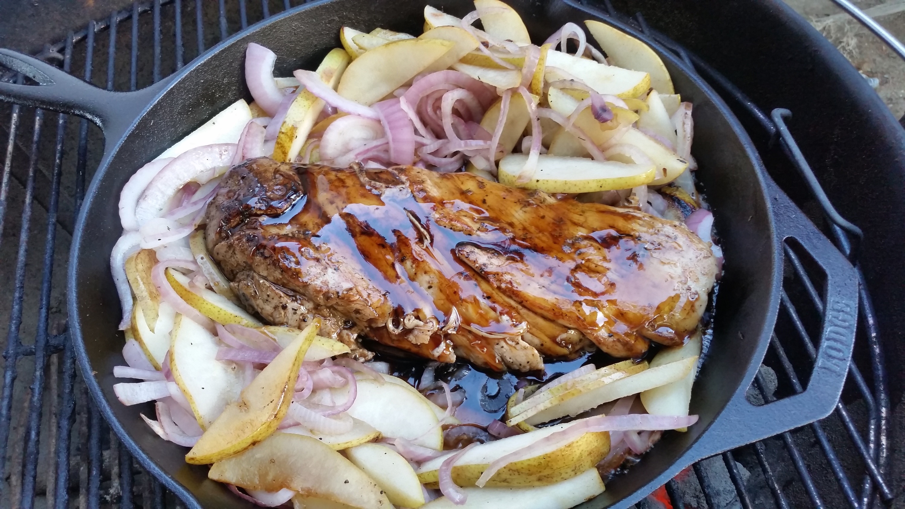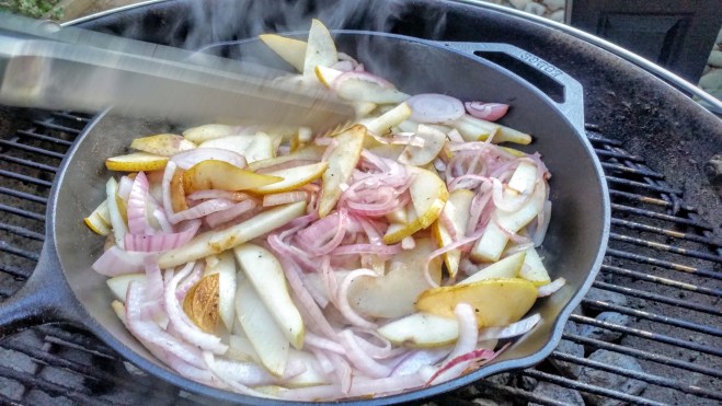We preheated the pan for about 20 minutes, on the grill. Over direct heat, we added olive oil to the pan and seared the tenderloin. We then put the pork off to the side as it was time to sauté the onions and pears.
