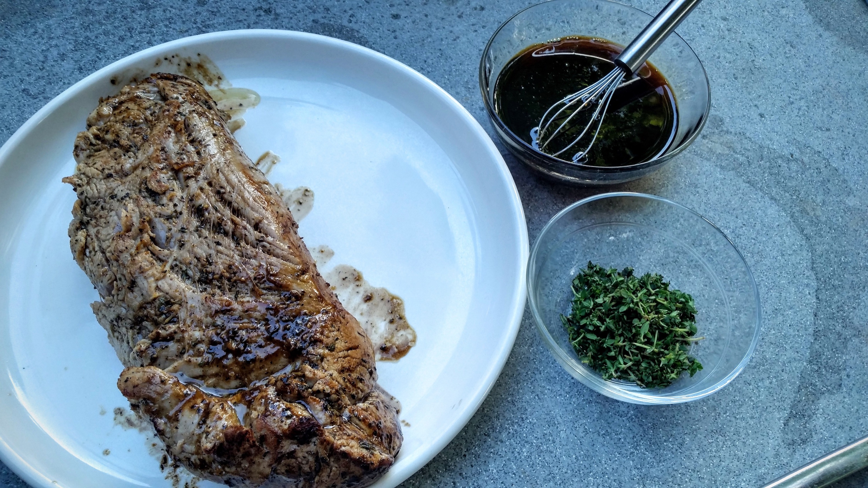 Stevo had a hankering to grill so although the recipe called for searing on the stove and then going into an oven, we decided to improvise. I needed the juices from the pork to help with the sauce so I decided to break out the cast iron pan.