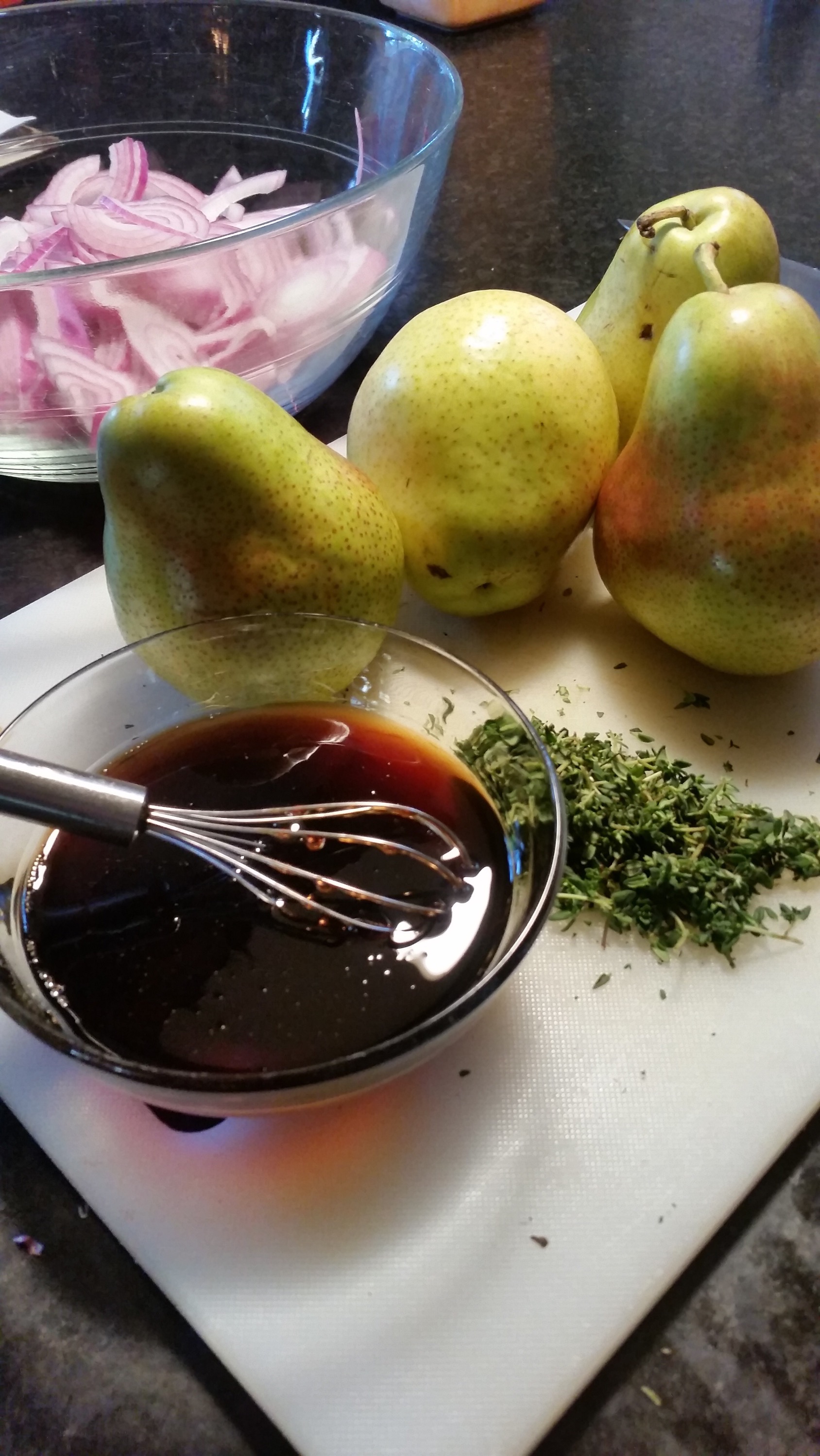 Simple fresh ingredients like, pears, thyme, red onion, a good quality balsamic vinegar and honey, were transformed into a sweet, rich, healthy meal.