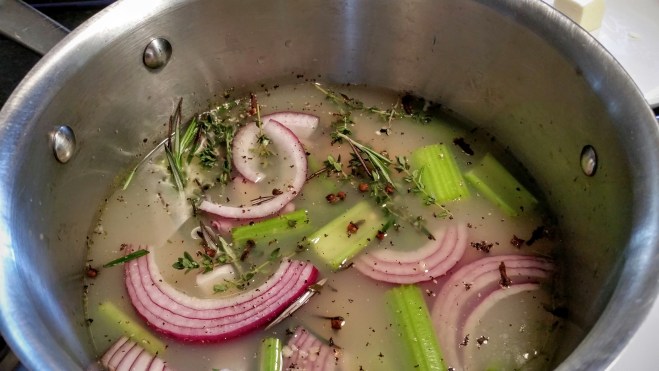 I added onion, celery, chicken broth, (not stock…although that would also work), some white wine, (optional), cloves, peppercorns, and thyme.