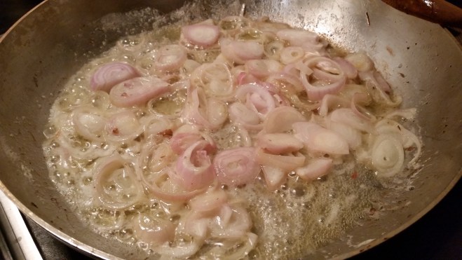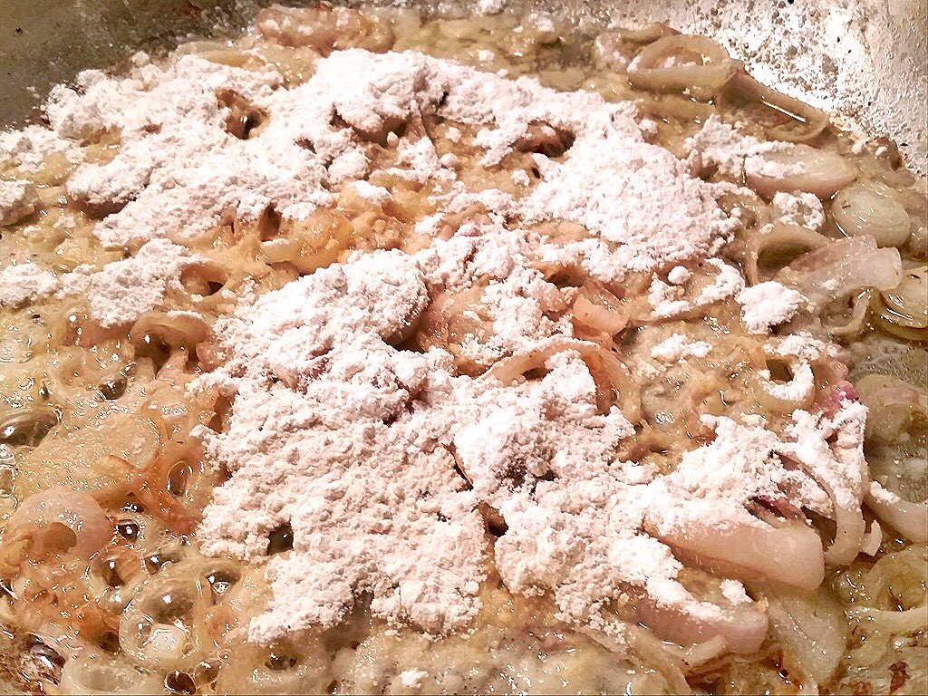 Once the mushrooms are done, they get set aside and in goes a little more butter to sautée the shallots. Because your going to strain the gravy, there’s no need to surgically dice them. Just slice them and throw them in.
