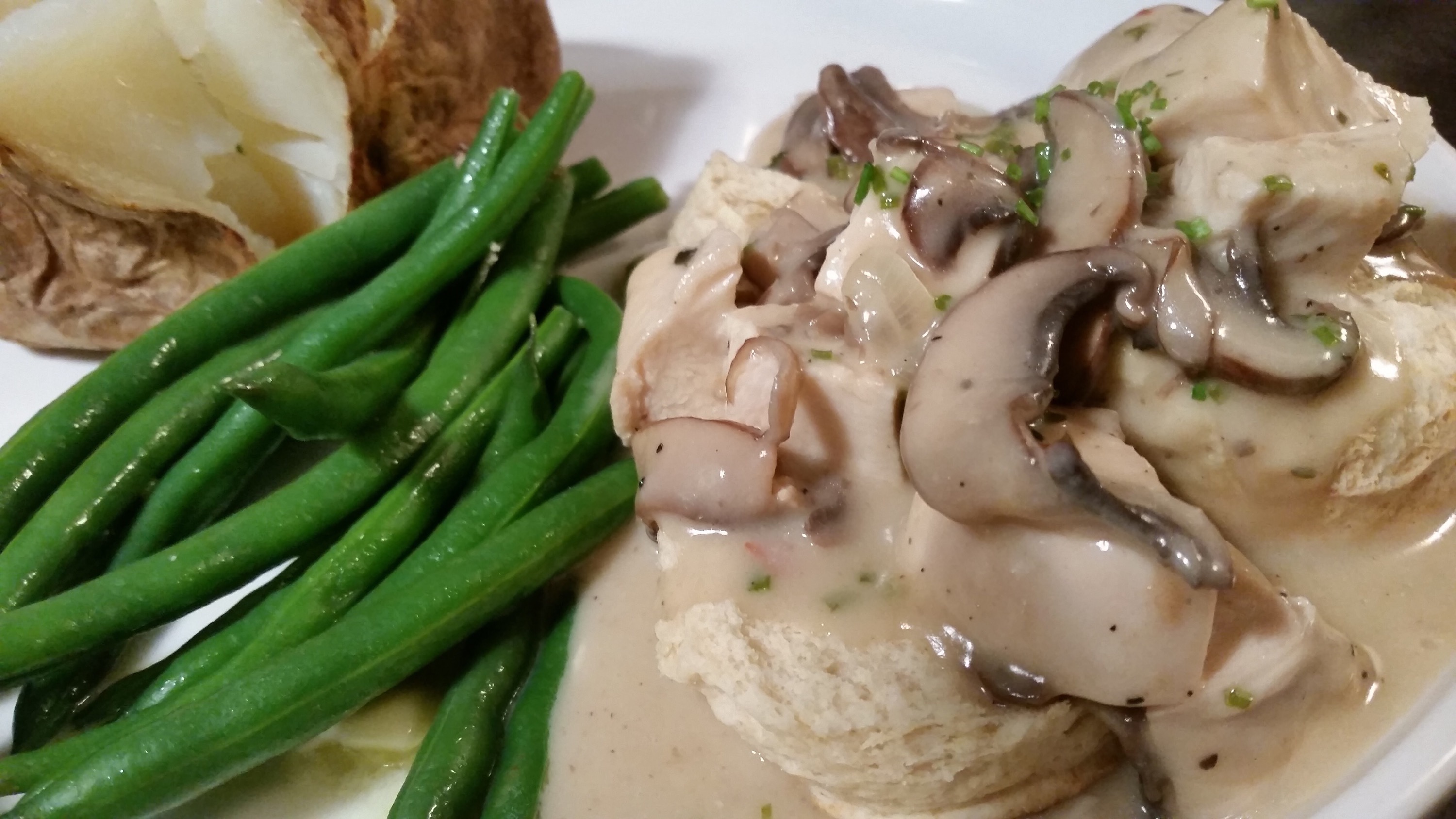 Under that delicious mountain of chicken, mushrooms and gravy, are a few split biscuits that have been warmed.