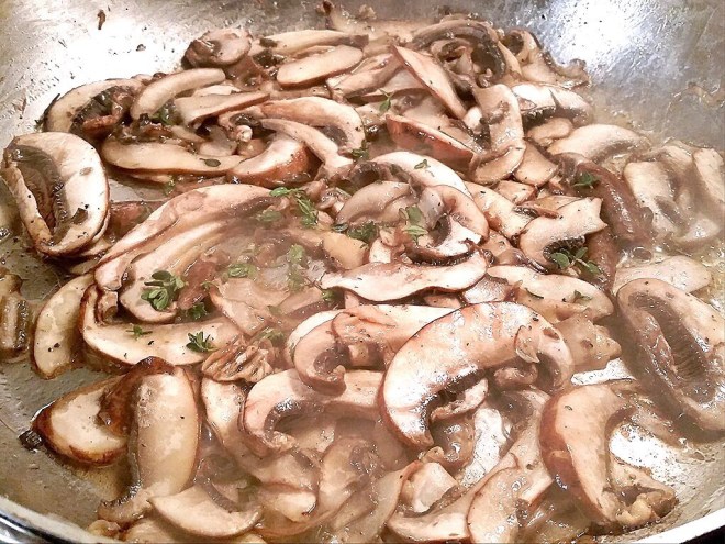 I sliced 6 oz of Bella mushrooms. Any kind of mushrooms will do but I tend to avoid those sad pre-sliced white ones. They get sautéed with butter, thyme, salt and pepper, until they’re soft.