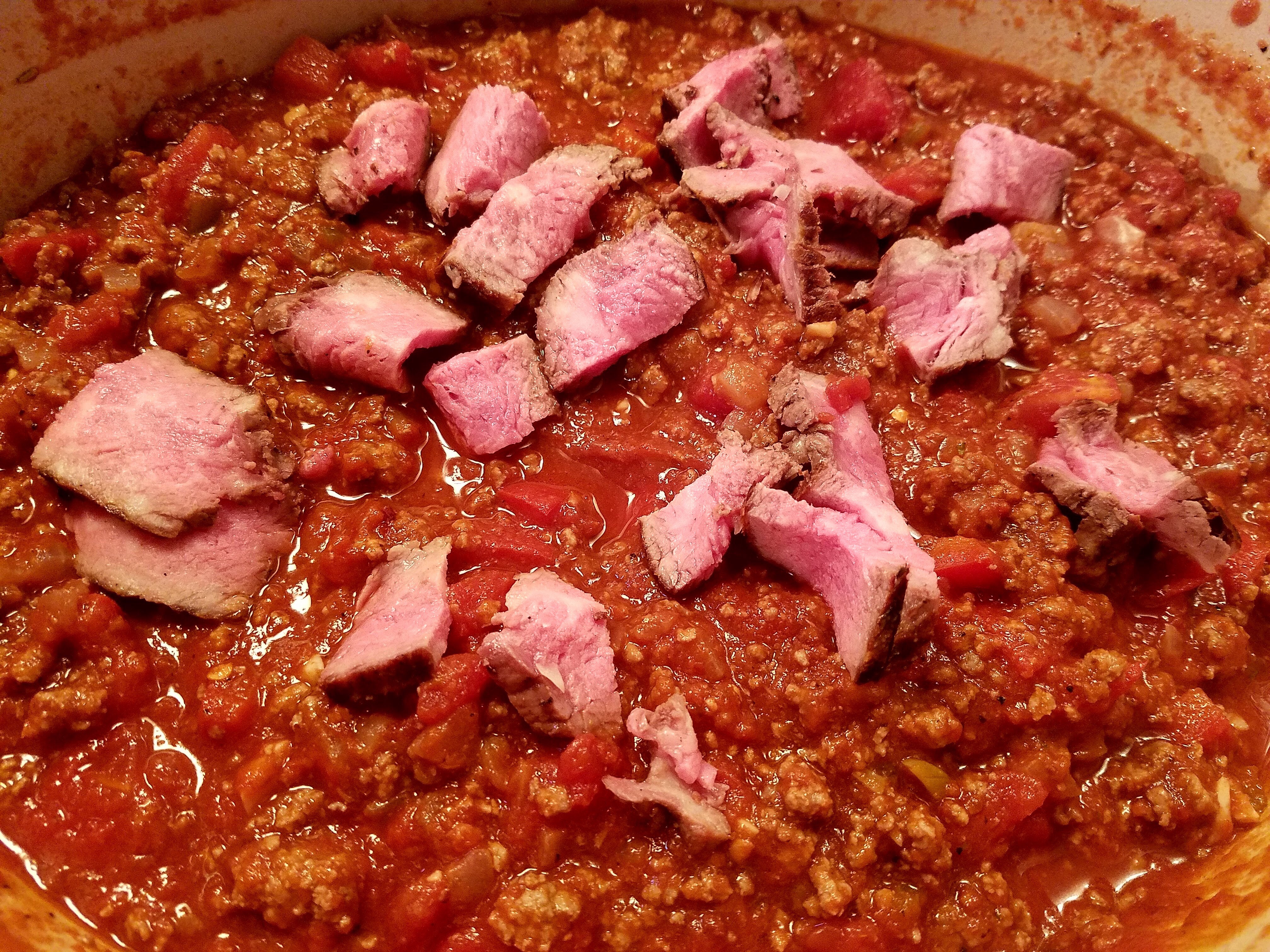 The drained meat / onions / bell pepper mixture gets added back to the pot for a quick simmer. We had leftovers from an incredible NY sirloin that we opted to throw in. You could also substitute the ground beef for hot Italian sausage.